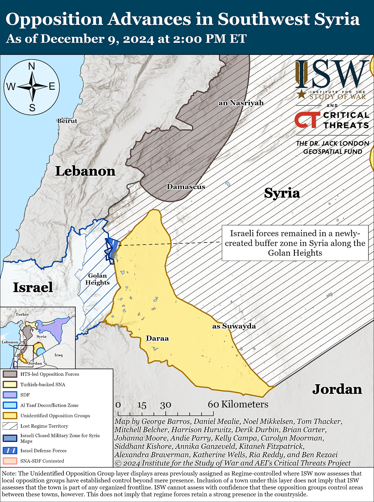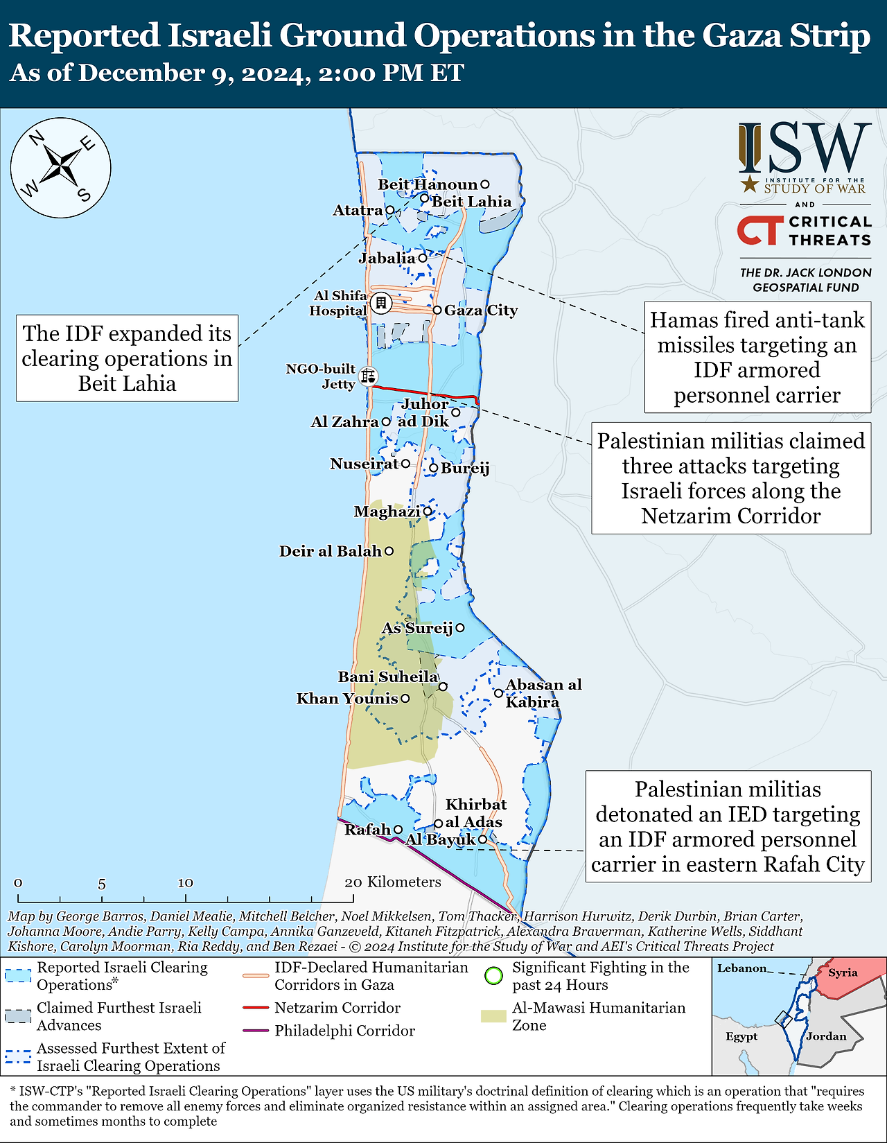 여기를 클릭하면 CTP와 ISW의 이스라엘 지상 작전 대화형 지도를 볼 수 있고, 여기를 클릭 하면 CTP와 ISW의 시리아 대화형 지형 통제 지도를 볼 수 있습니다. 이 지도는 이 보고서에 있는 정적 지도와 함께 매일 업데이트됩니다.