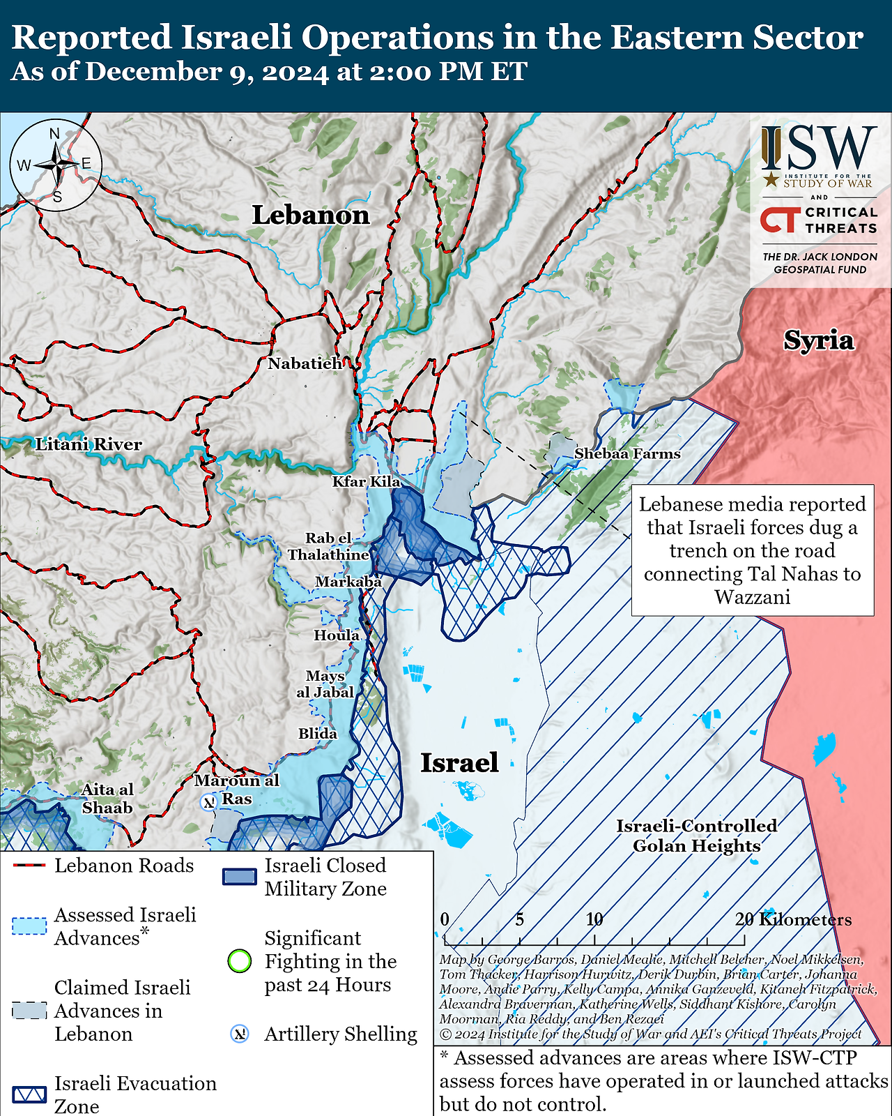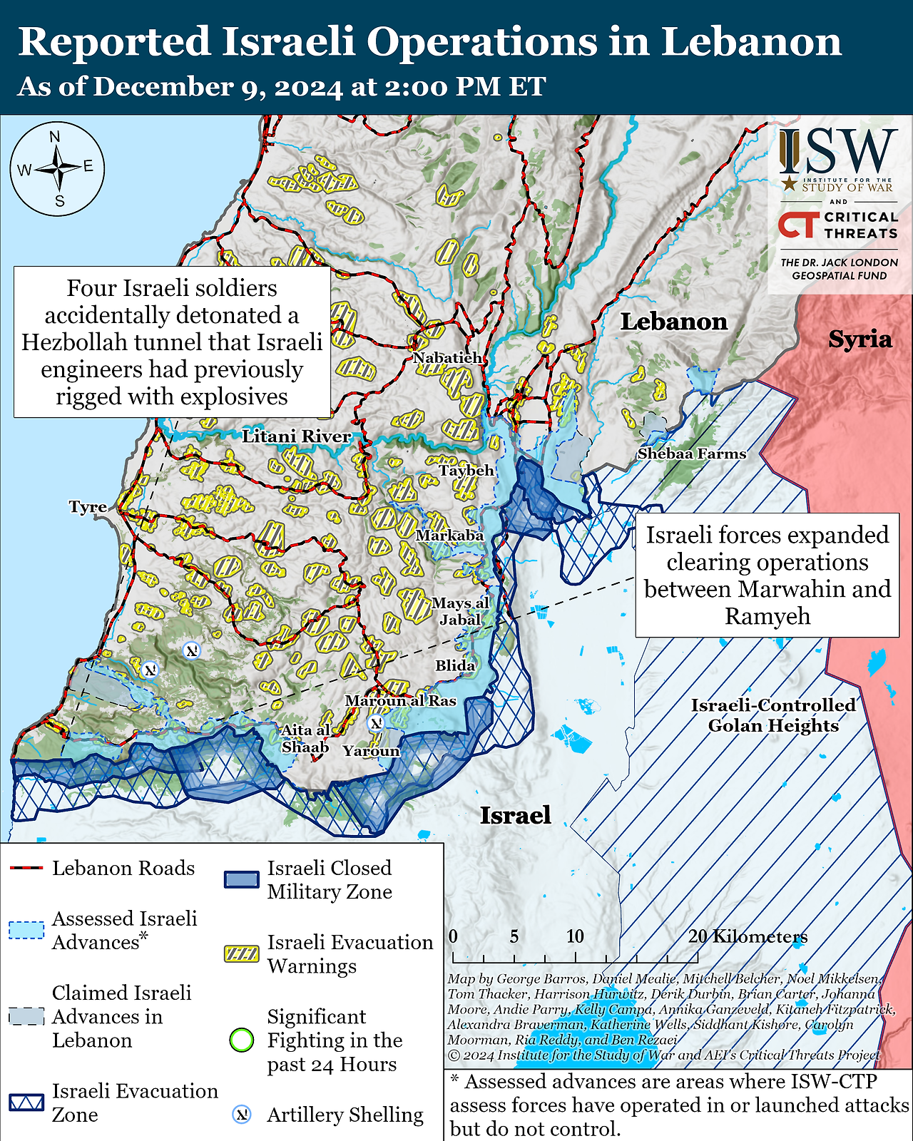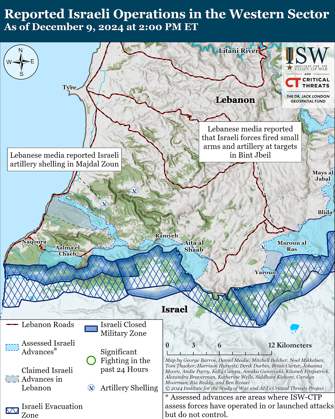 이스라엘군은 CTP-ISW가 12월 8일에 마지막으로 데이터를 수집한 이후로 마룬 알 라스 근처에서 작전을 계속해 왔습니다 . 헤즈볼라 계열 언론은 12월 9일에 IDF가 마룬 알 라스의 민간 인프라를 파괴했다고 보도했습니다.[72] 레바논 언론은 IDF가 CTP-ISW가 마지막으로 데이터를 수집한 이후로 마룬 알 라스 북쪽의 빈트 주베일의 표적에 포격과 소총 사격을 가했다고 보도했습니다.[73]