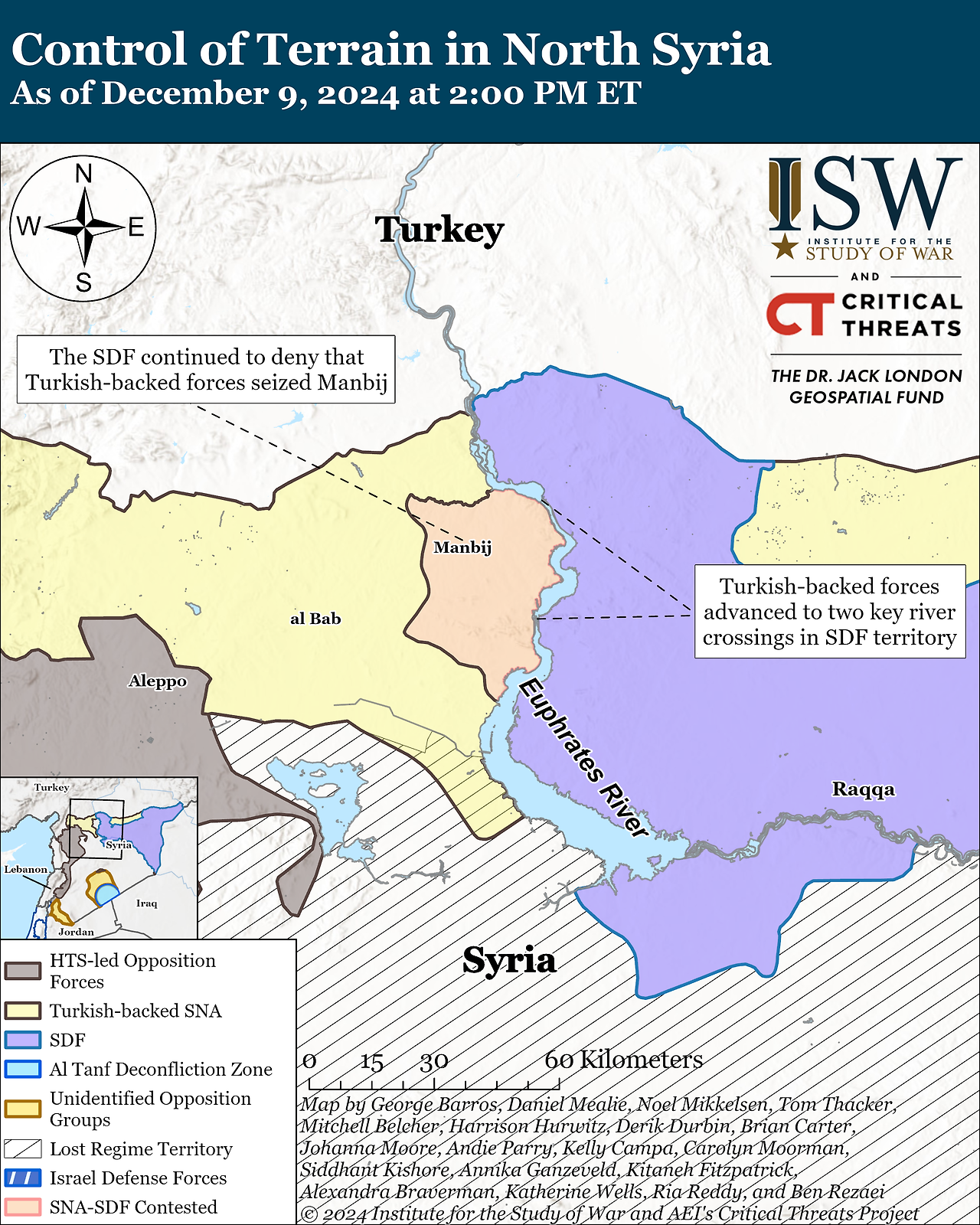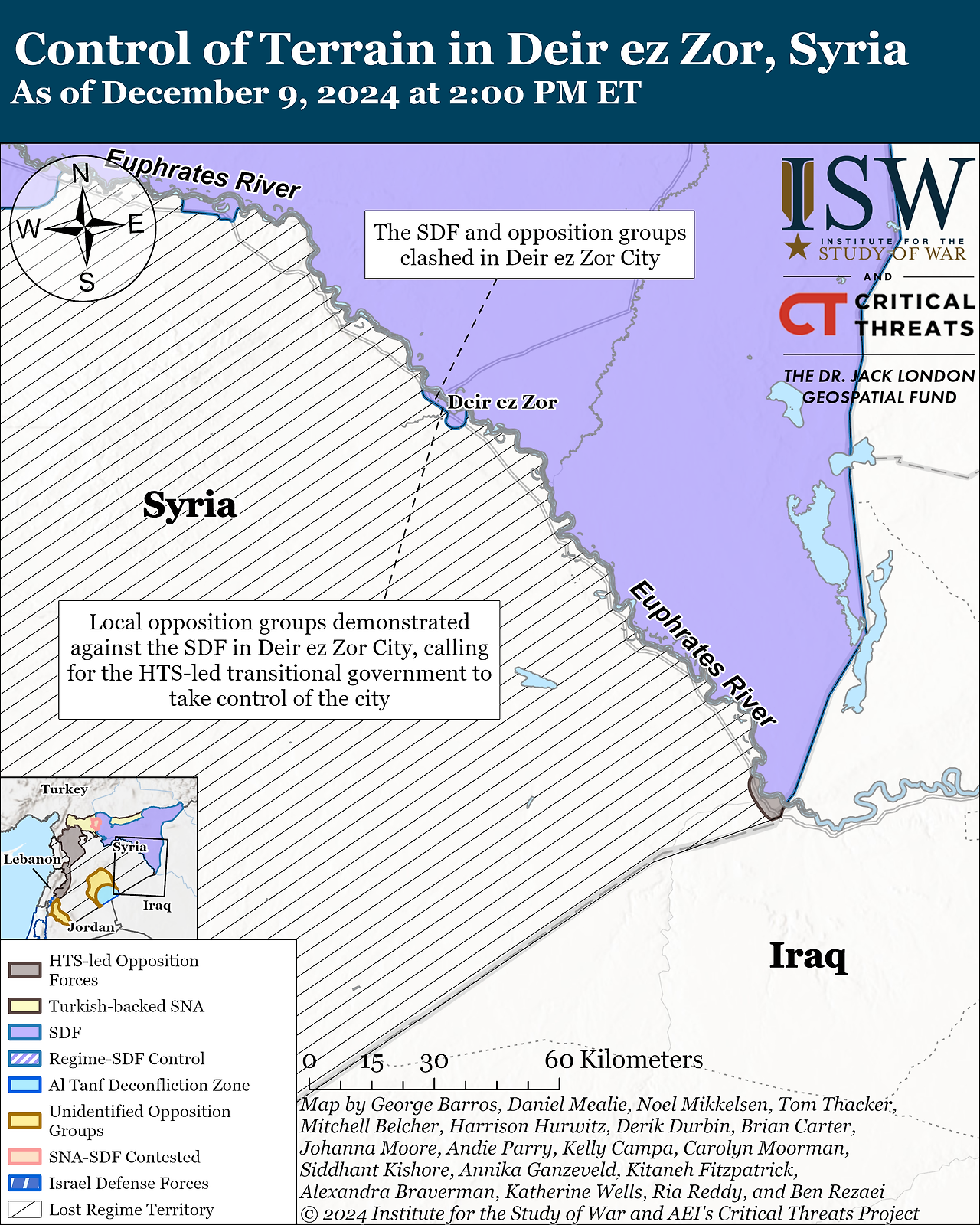 SDF는 또한 12월 6일에 시리아 정권으로부터 탈환한 데이르 에조르 주 지역에서 지역적 반대에 직면해 있습니다.[22] 지역 반대 집단은 12월 9일에 데이르 에조르 시에서 시위를 벌이며 HTS가 이끄는 과도 정부가 이 도시를 장악할 것을 요구했습니다.[23] 지역 언론은 SDF가 시위대에 발포하여 여러 명을 사살했다고 보도했습니다.[24] HTS 계열인 파테흐 무빈 작전실은 아사드가 나라를 떠나기 직전인 12월 7일에 그 군대가 데이르 에조르 시에서 작전을 수행하고 있었다고 확인했습니다.[25] 그 후로 지역 언론은 파테흐 무빈과 제휴한 호송대가 데이르 에조르와 알부 카말 사이에서 작전을 수행하고 있다고 보도했지만 SDF와 HTS 계열 군대 간의 직접적인 충돌을 보고하는 신뢰할 수 있는 출처는 거의 없습니다.[26] SDF와 지역 반대 세력 간의 교전은 HTS 계열 세력이 Deir ez Zor 회랑에 대한 완전한 보안 통제를 확립하지 못했다는 것을 보여줍니다.[27]