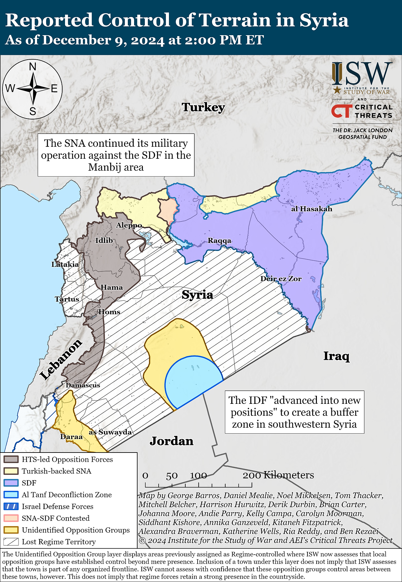 - 시리아의 이스라엘 : 이스라엘 방위군(IDF)은 12월 9일 골란고원을 따라 시리아에 완충지대를 계속 구축했습니다. IDF 공군은 12월 9일 시리아의 전 SAA 및 레바논 헤즈볼라 시설을 표적으로 공습을 계속했습니다.