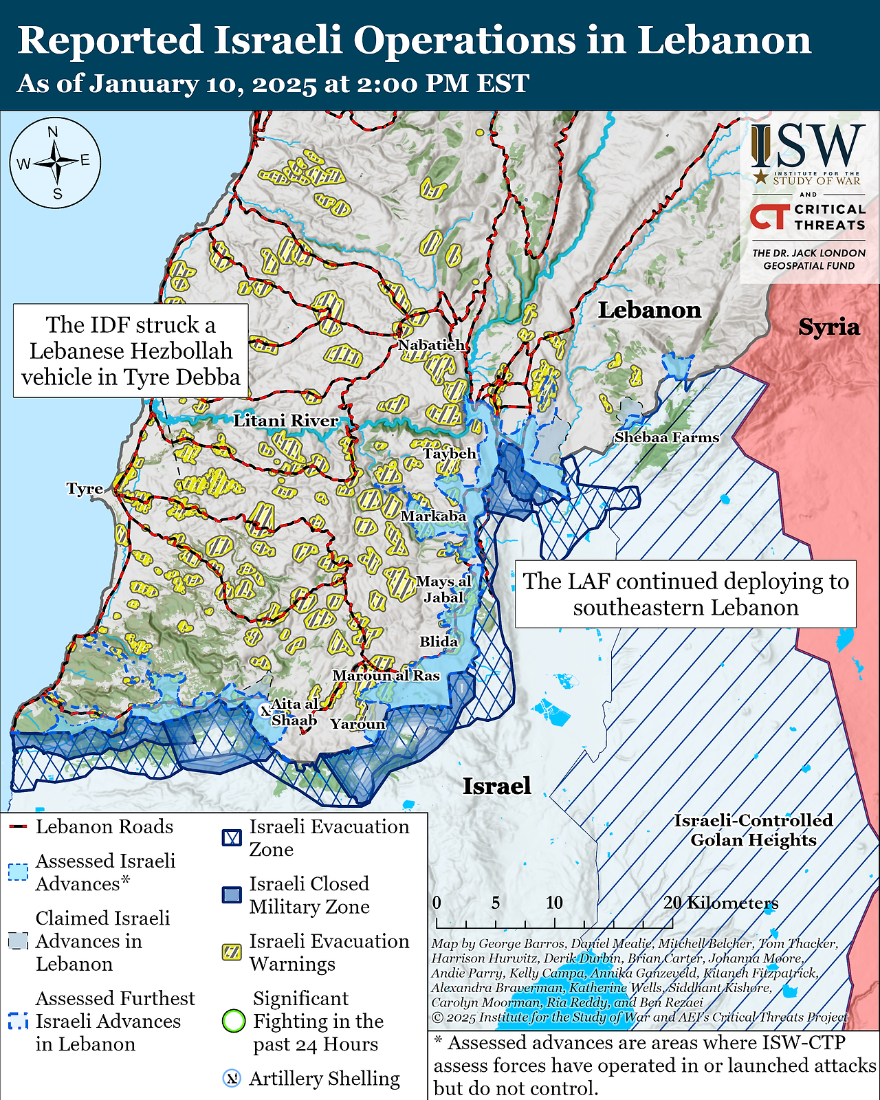LAF는 1월 10일 레바논 남부의 아이타룬(Aitaroun)과 아이타 알 샤브(Aita al Shaab)에 배치를 시작했습니다 . 레바논 언론은 LAF 기갑부대가 아이타룬에 진입했다고 보도했습니다.[66] IDF는 마지막으로 아이타룬에서 작전을 수행한 것은 1월 6일이라고 합니다.[67] 레바논 언론은 또한 IDF가 아이타 알 샤브 주변에 포병을 발사하고 그날 일찍 해당 지역에서 여러 개의 폭발물을 터뜨린 후 LAF가 아이타 알 샤브 외곽에 접근했다고 보도했습니다.[68]