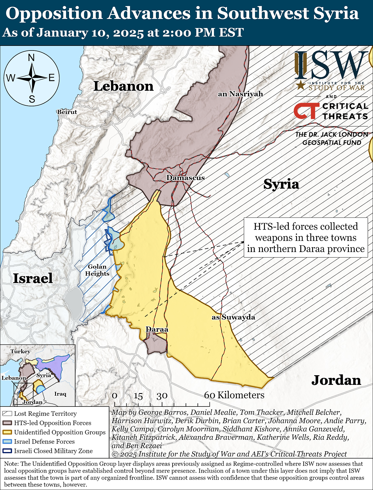 여기를 클릭하면 CTP와 ISW의 이스라엘 지상 작전 대화형 지도를 볼 수 있고, 여기를 클릭 하면 CTP와 ISW의 시리아에서 진행 중인 반대 세력 공세 대화형 지도를 볼 수 있습니다. 이 지도는 이 보고서에 있는 정적 지도와 함께 매일 업데이트됩니다.