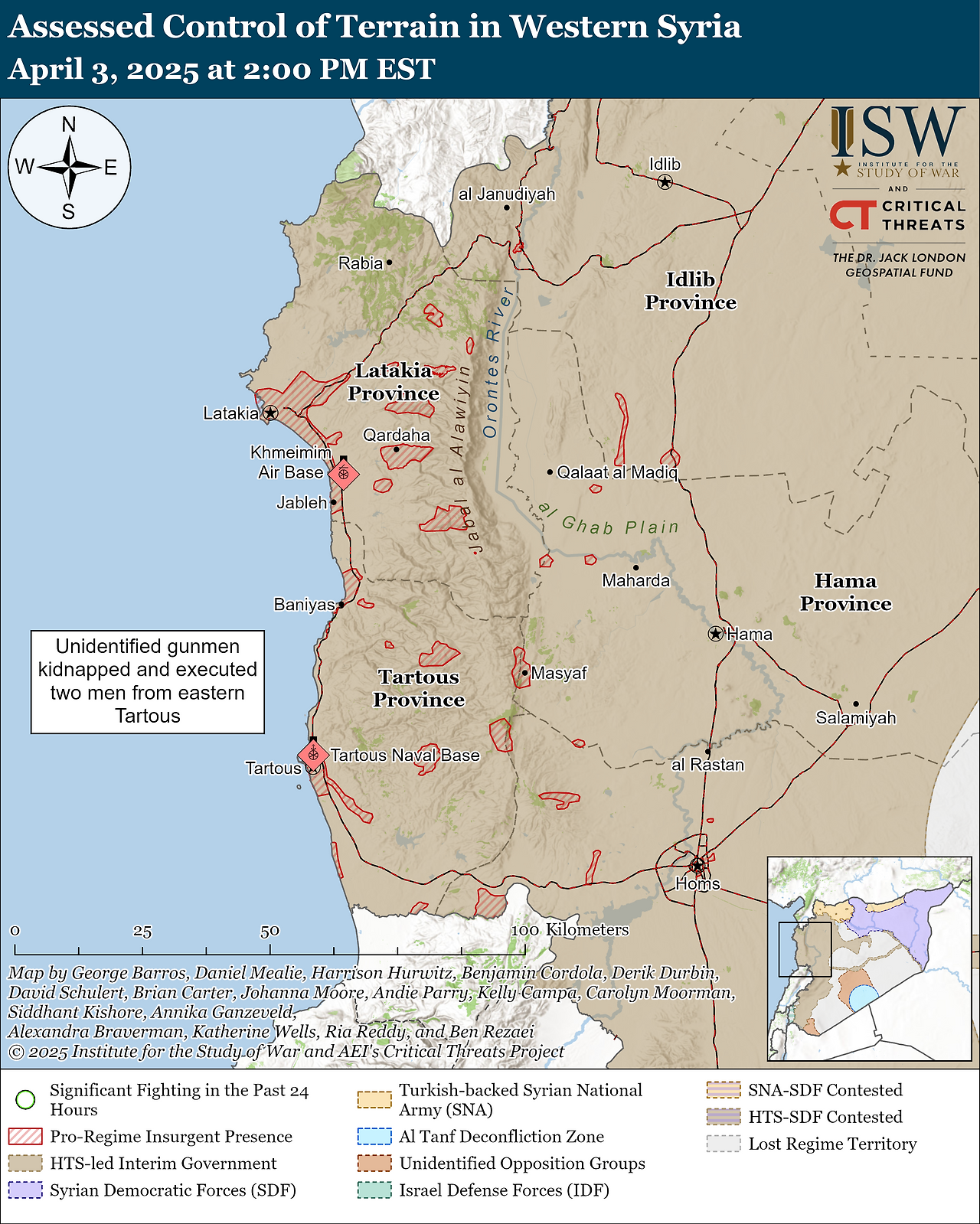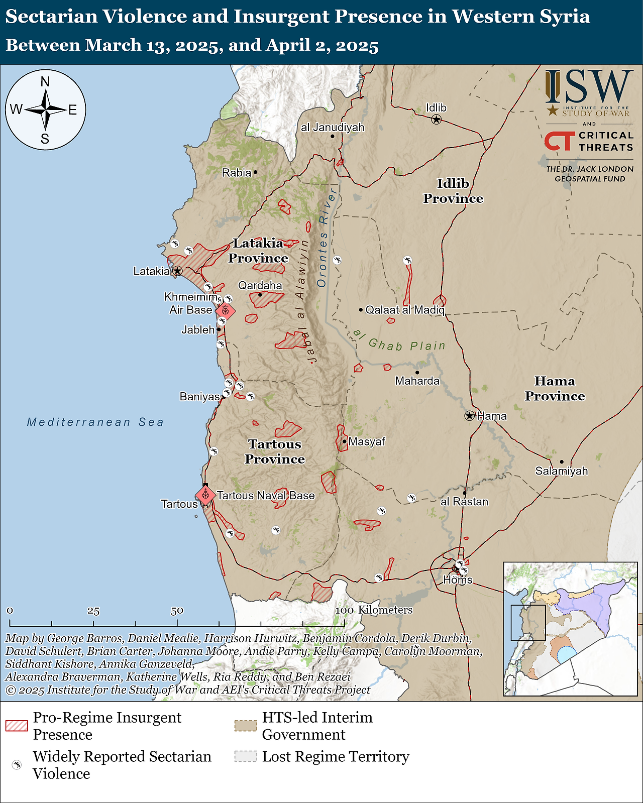 시리아 정부군이 시리아 서부의 검문소에서 보인 부당한 처사는 보안군과 지역 알라위트 시민 간의 관계를 더욱 약화시킬 위험이 있으며, 이는 반군에게 이로울 것입니다. 시리아 임시 정부는 보안을 개선하고 반군의 이동의 자유를 제한하기 위해 시리아 서부 전역에 검문소를 설립했습니다. 이러한 검문소를 담당하는 전투원들은 사법 외 살인과 사고로 민간인을 여러 차례 죽였습니다. 이는 보안군과 지역 주민 간의 관계를 손상시키고 반군이 착취할 기회를 제공할 위험이 있습니다. 라타키아의 하르프 알 마사이타라 인근의 보안군은 3월 27일에 검문소에서 멈추지 않은 두 사람을 사살했습니다.[51] 차량이 왜 멈추지 않았는지 또는 검문소를 담당하는 사람들이 경고 사격을 했는지는 불분명합니다. 별도로 지역 주민들은 3월 31일에 검문소 근처에서 처형된 알라위트 남자의 시신을 발견했습니다.[52] 이러한 사건은 반군에게 검문소를 공격하고 알라위트 지역에서 정부군을 몰아내려고 시도함으로써 지역 주민의 수호자로서 자신을 보여줄 기회를 제공합니다. 알라위트 반군은 3월 초부터 정부 검문소에 대한 주기적인 공격을 수행해 왔습니다.[53] 반군은 정부 부대가 외곽 검문소를 유지할 수 없게 만들어 제거하도록 강요할 수 있습니다.
