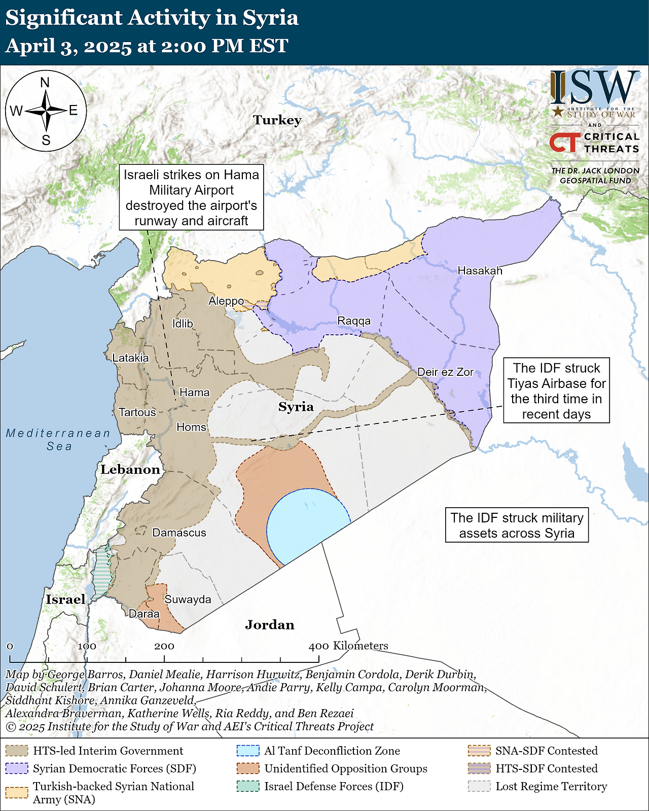 이스라엘은 이전에 2024년 12월에 아사드 정권이 남긴 장비와 무기를 파괴하기 위해 다마스쿠스 근처의 하마 군사 공항과 이전 SAA 위치를 공격했습니다.[46] 이스라엘은 최근 3월 21일과 3월 24일에 티야스 공군 기지를 공격했습니다.[47] 터키는 시리아 임시 정부와의 잠재적 방위 협정의 일환으로 티야스에 공군 기지를 설립하려 하고 있다고 합니다.[48] 지정되지 않은 이스라엘 소식통은 4월 2일에 이스라엘 언론에 IDF가 이스라엘이 시리아에 군사 기지를 설립하는 것을 허용하지 않을 것이라는 메시지를 터키에 보내기 위해 공습을 실시했다고 말했습니다.[49] 이스라엘 국방부 장관인 이스라엘 카츠는 이 공습을 "미래에 대한 경고"라고 불렀습니다.[50]