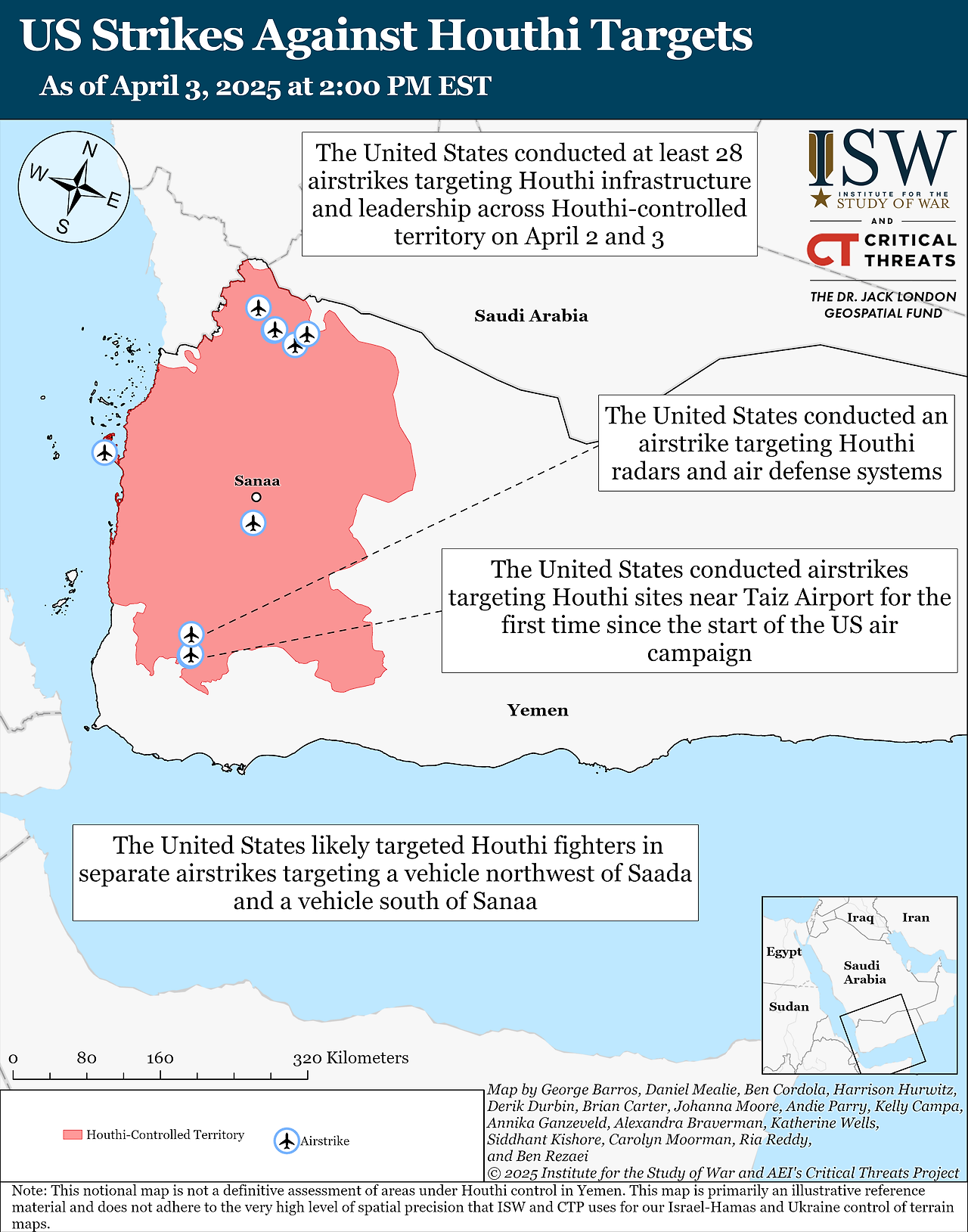 미국 중부 사령부(CENTCOM)는 4월 2일 CTP-ISW의 마지막 데이터 차단 이후 예멘의 후티 통제 지역에서 후티 인프라와 지도부를 표적으로 최소 28회의 공습을 실시했습니다.[21] CENTCOM은 3월 15일 미국 공습이 시작된 이후 처음으로 타이즈 공항 근처의 후티 시설을 표적으로 삼아 불특정 수의 공습을 실시했습니다.[22] CENTCOM은 또한 후티 레이더와 방공 시스템이 있는 것으로 알려진 이브 주, 자블라 지구의 예멘-오만 통신 시설을 표적으로 삼았습니다.[23] CENTCOM은 사나 남쪽의 차량을 표적으로 공습을 실시했습니다. 이 공습으로 후티 내무부 장관인 압둘카림 알 후티의 개인 비서가 사망한 것으로 알려졌으며, 그는 후티 최고 지도자 압둘말릭 알 후티의 삼촌입니다.[24] CTP-ISW는 이 주장을 확인할 수 없습니다. CENTCOM은 또한 사다 북서쪽의 차량을 표적으로 삼은 별도의 공습에서 후티 전투원을 표적으로 삼았을 가능성이 있습니다.[25]