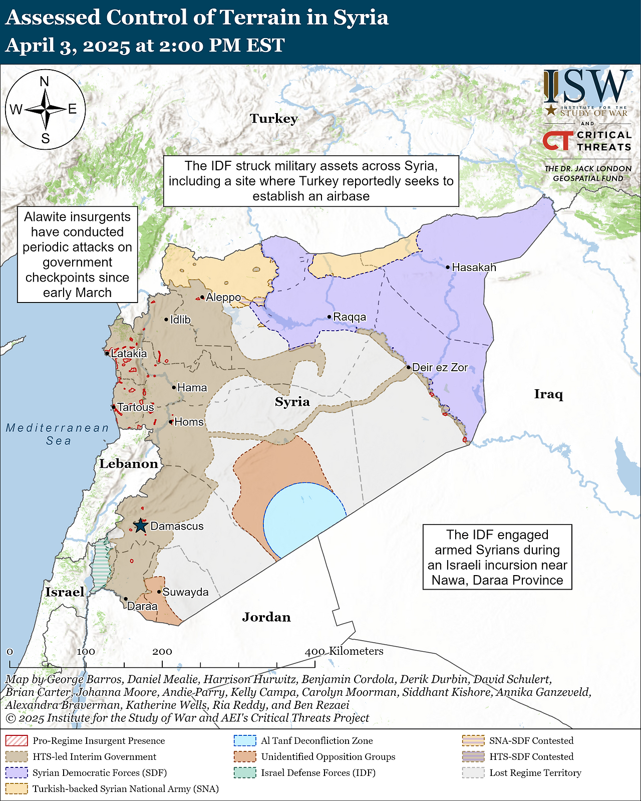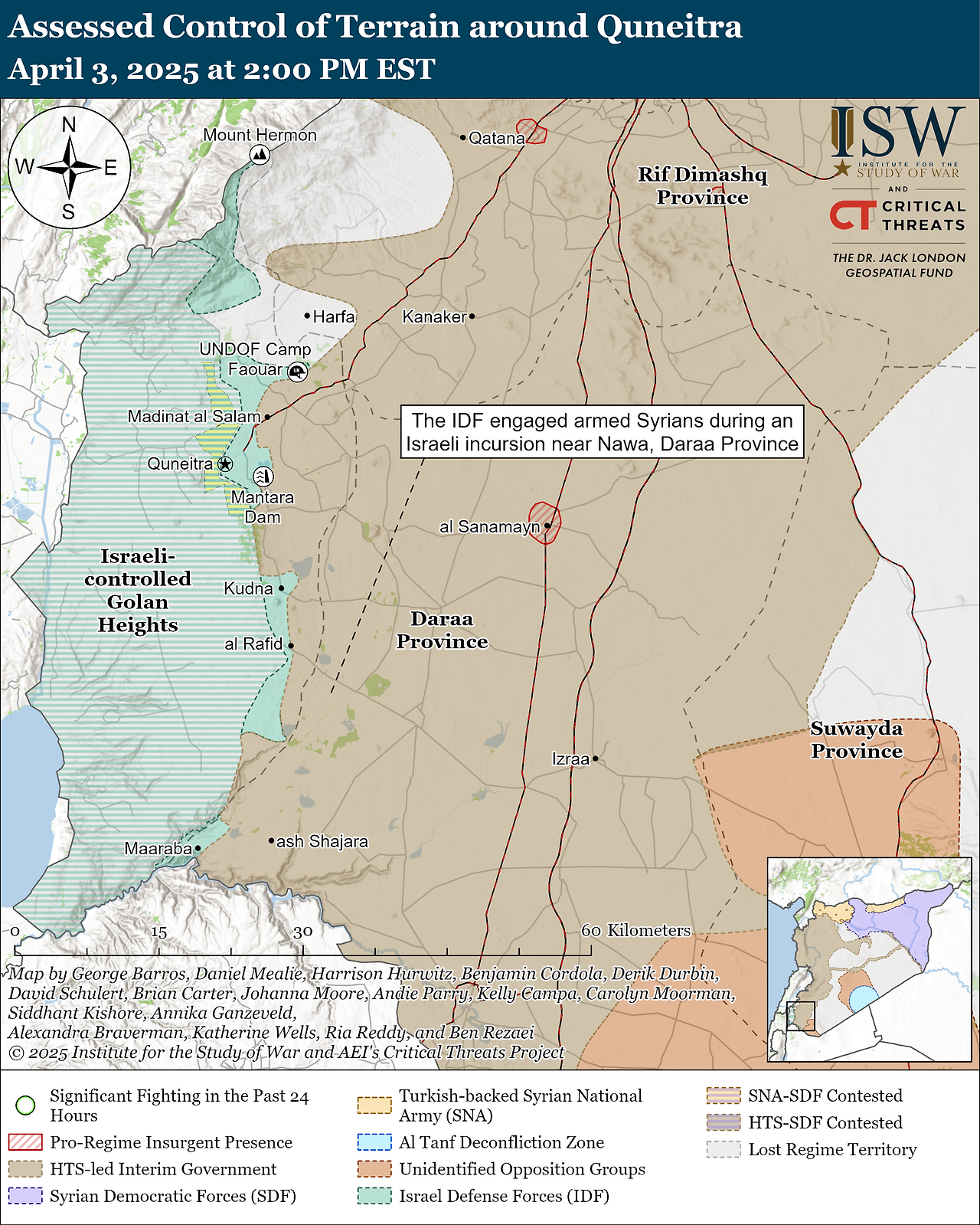 - 시리아에서의 이스라엘 활동: IDF는 4월 2일 다라아 주 나와 근처에서 시리아 영토로 13km 떨어진 곳에서 이스라엘이 침공하는 동안 무장 시리아인과 교전했습니다. 이 사건은 IDF가 3월 25일 다라아 주 쿠와야에서 무장 시리아인 최소 4명을 사살한 이후로 시리아가 남부 시리아 영토로 진군하는 이스라엘군을 공격한 두 번째 사건입니다. 이 사건은 이스라엘과 임시 정부에 반대하는 무장 집단이 지원을 얻고 새로운 전투원을 모집할 기회를 제공할 수 있습니다.