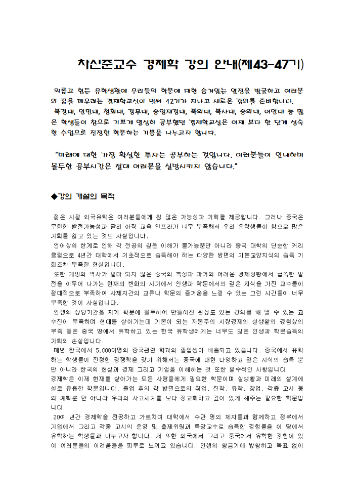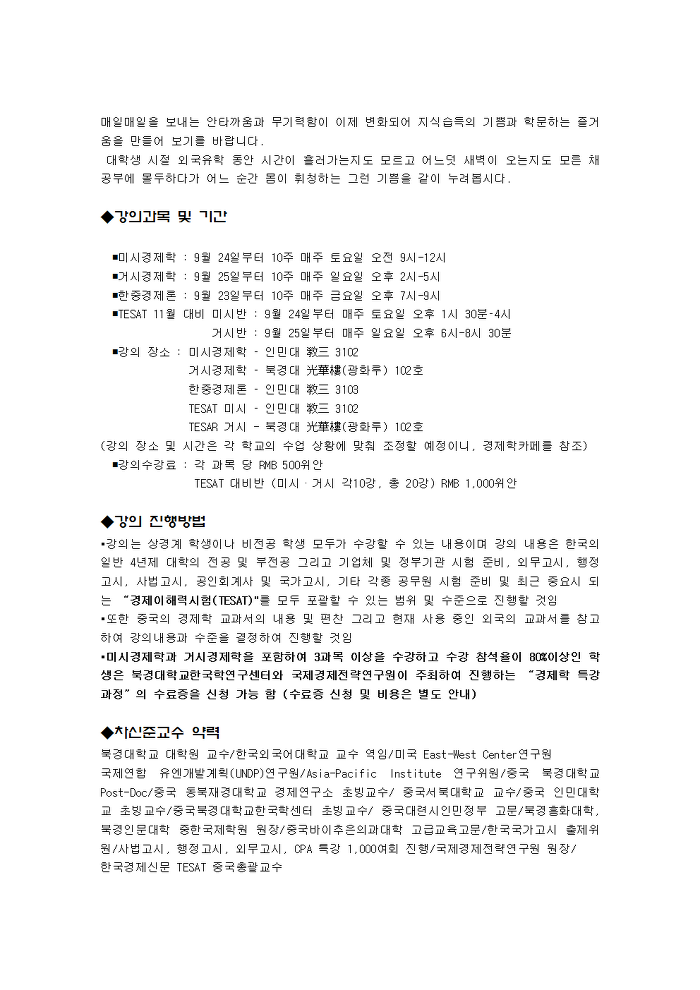 2011년 가을학기 경제학교실 강의안내서 (수정) 작성자최선혜|작성시간11.09.15|조회수253 목록 댓글 4 글자크기 작게가 글자크기 크게가 다음검색 현재 게시글 추가 기능 열기 북마크 공유하기 신고 센터로 신고 댓글 댓글 4 댓글쓰기 답글쓰기 댓글 리스트 작성자김동리 | 작성시간 11.09.16 인민대학교 경관카페로 퍼가겠습니다^^* 작성자박여진 | 작성시간 11.09.16 중앙재경대 카페로 퍼갈께요 ~ 작성자최동인 | 작성시간 11.09.17 경무대 한국유학생 카페에 스크랩해가요~ 작성자이소연 | 작성시간 11.09.20 태셋 듣고싶어요ㅠ 근데 미시가 제스케줄이랑 겹쳐서..... ㅠ 댓글 전체보기