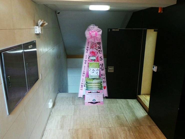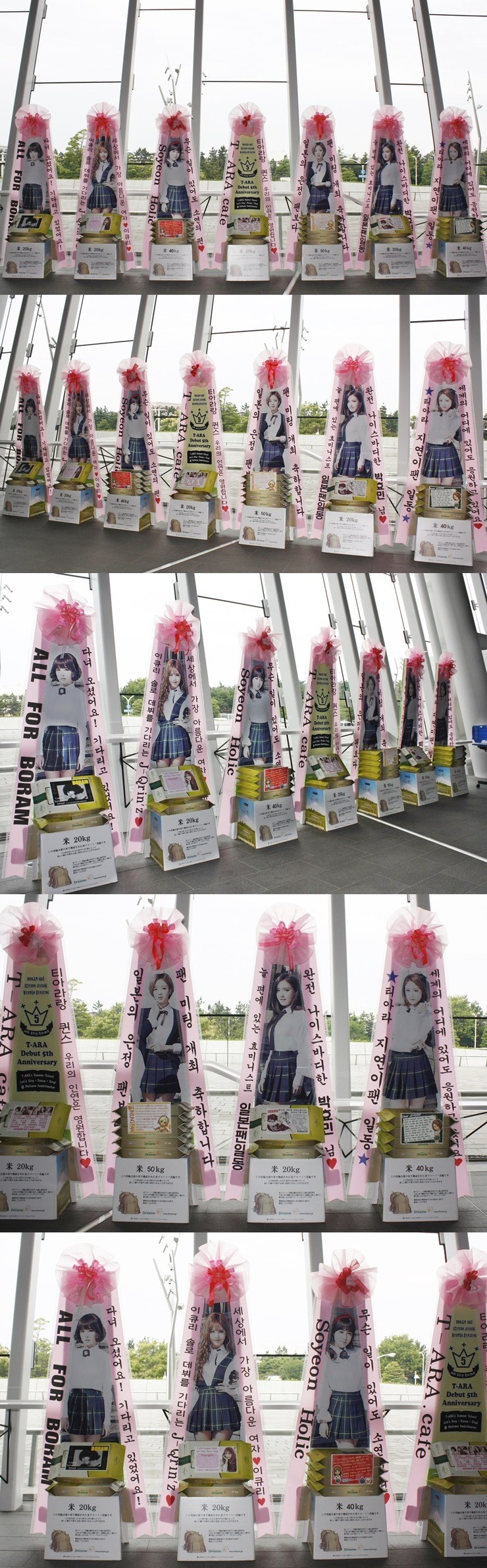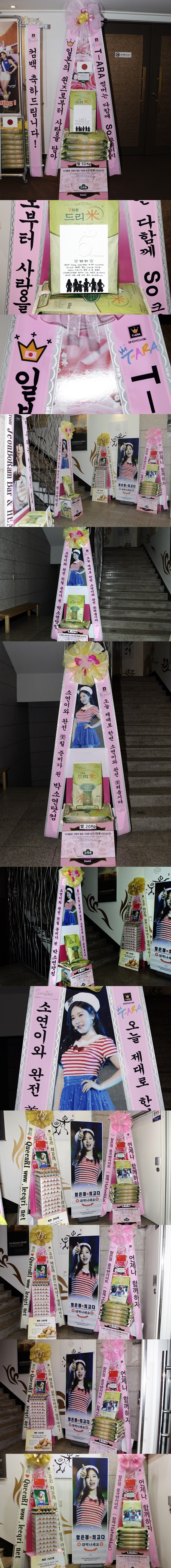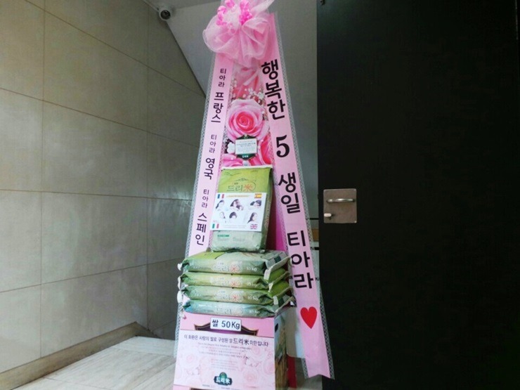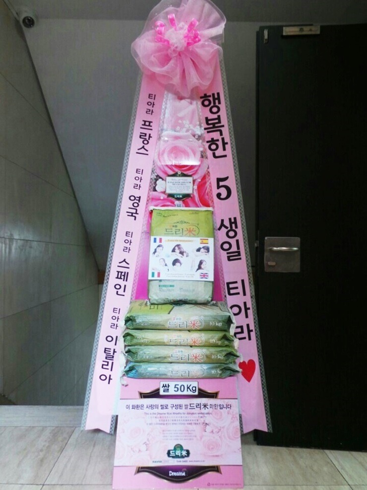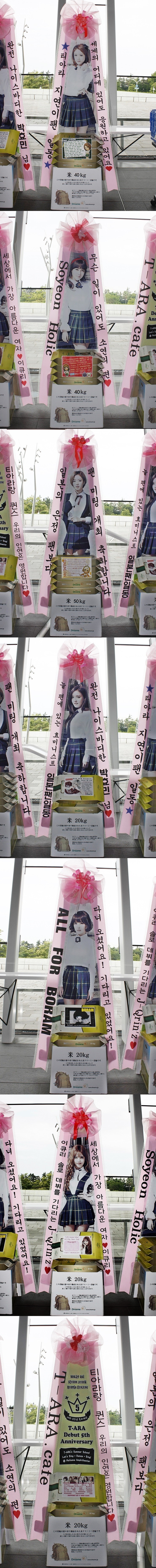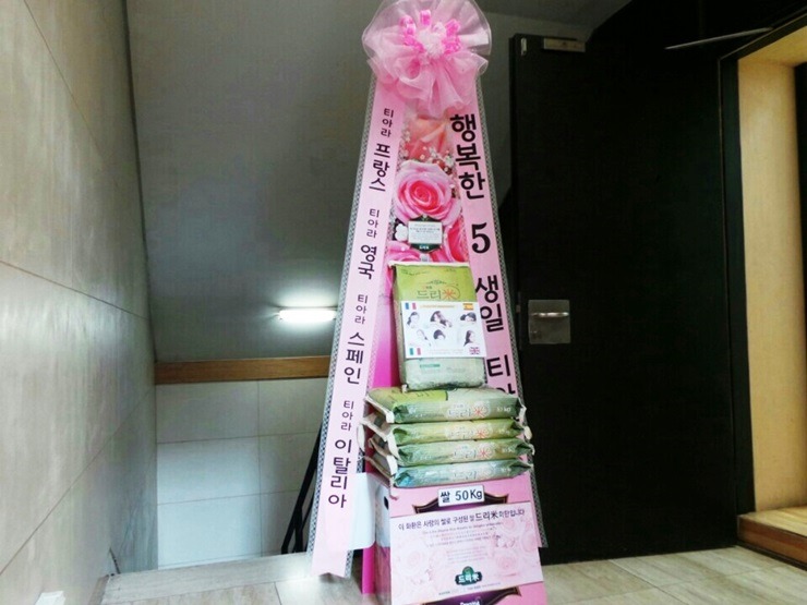 * 2014년 7월 29일 그룹 티아라(T-ara 보람, 지연, 효민, 은정, 큐리, 소연) 데뷔 5주년 축하 드리미 쌀화환