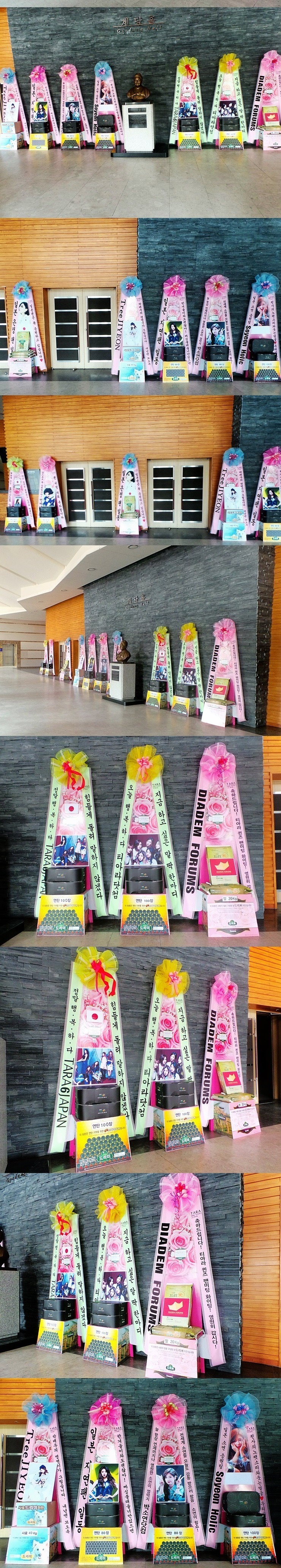 * 2015년 8월 3일 그룹 티아라(T-ara 보람, 지연, 효민, 은정, 큐리, 소연) 11번째 미니앨범 ‘쏘 굿(So Good)’ 발매 기념 쇼케이스 티아라 응원 쌀드리미화환, 알부자드리미화환, 사료드리미화환