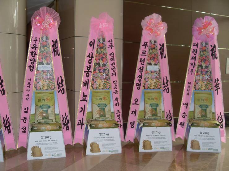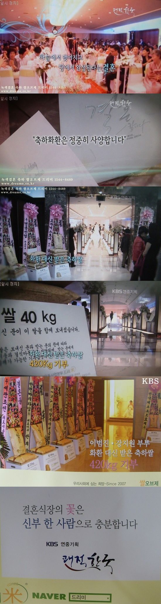 10일 서울 리베라호텔 웨딩홀에서 결혼식을 올린 신랑신부는 결혼축하화환으로 드리미 쌀오브제 쌀화환을 받아 녹색결혼을 실천했다. 신랑신부는 결혼청첩장에 "축하화환은 정중히 사양합니다. 정히 보내실 분은 화환 대신 드리미 쌀오브제 쌀화환으로 보내주시면 좋은 날 소외받는 이웃과 함께 사랑을 나누겠습니다"라는 내용의 드리미 안내문을 청첩장에 함께 넣어 보냈었다. 이날 결혼식장에는 결혼축하화환으로 드리미 쌀오브제 쌀화환이 답지해 하객들의 칭송을 받았다. 신랑신부는 신혼여행을 다녀온 후 드리미 쌀을 결식아동 등 어려운 이웃에게 기부할 예정이다. 드리미 쌀화환은 몇년 전부터 결혼식으로 인한 이산화탄소 발생량을 줄이고 쌀농가와 어려운 이웃을 돕기 위한 녹색결혼의 실천방법으로 의식있는 신랑신부들을 중심으로 급속히 확산되고있다. 드리미 쌀화환을 이용하려면 드리미(1544-8489)측에서 무료제공하는 드리미 안내장을 청첩장에 넣어보내기만 하면 된다.