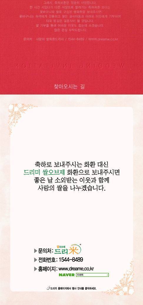 청첩장의 드리미 쌀화환 안내문구와 청첩장 삽지용 드리미 안내장