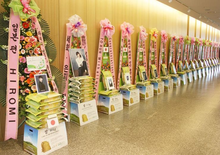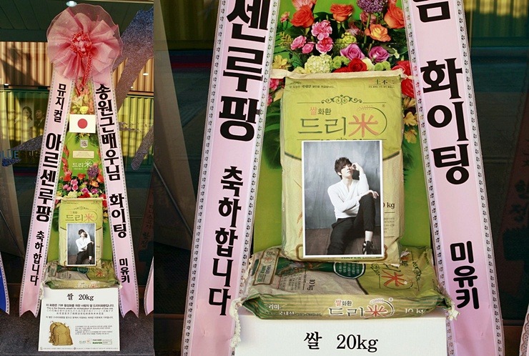 쌀화환에는 '뮤지컬 아가씨와 건달들 축하합니다. 송원근 배우님 화이팅 미유키'란 응원 메세지와 함께 드리미 농협쌀