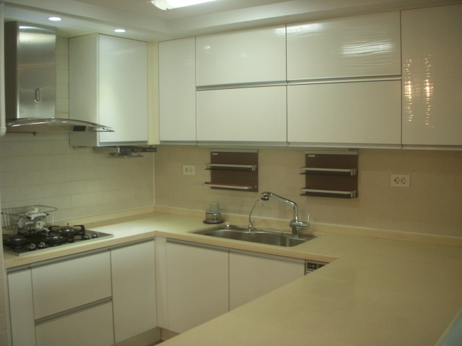 공사전 원래의 주방입니다 . 도장제품의 주방가구가 시간이 지나다보니 색상이 변질되어