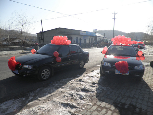풍선으로 장식을 한 결혼 축하객 차량. 동수구로 가던 중 한 촌에서 만났다.