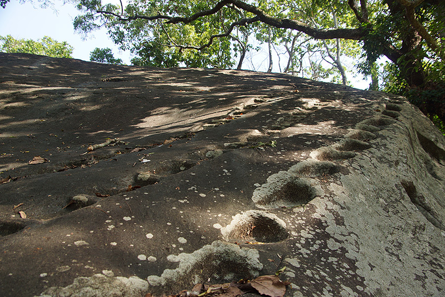 <바위가 움푹움푹 파인 것은, 바위 위에 기둥을 세우기 위한 받침 구멍이다. 그냥 바위에 기둥을 세우면 미끄러지겠지만, 이렇게 구멍을 파 놓고 그곳에 기둥을 세우면 기둥이 견고하게 서 있을 것이다.>