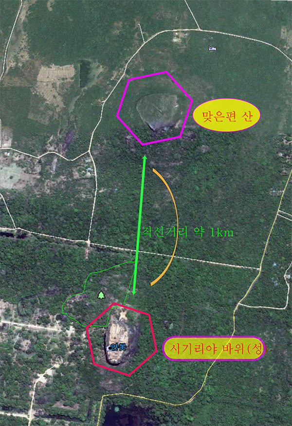 시기리야 바위 정상에서 보면 약 1키로 떨어진 곳에, 시기리야 바위와 거의 비슷한 또 하나의 산이 우뚝 솟아 있는 것을 볼 수 있다. 사실 시기리야 바위를 촬영하려면 항공 촬영을 하거나, 바로 맞은편에 산에 가서 시기리야 바위를 찍어야 한다.