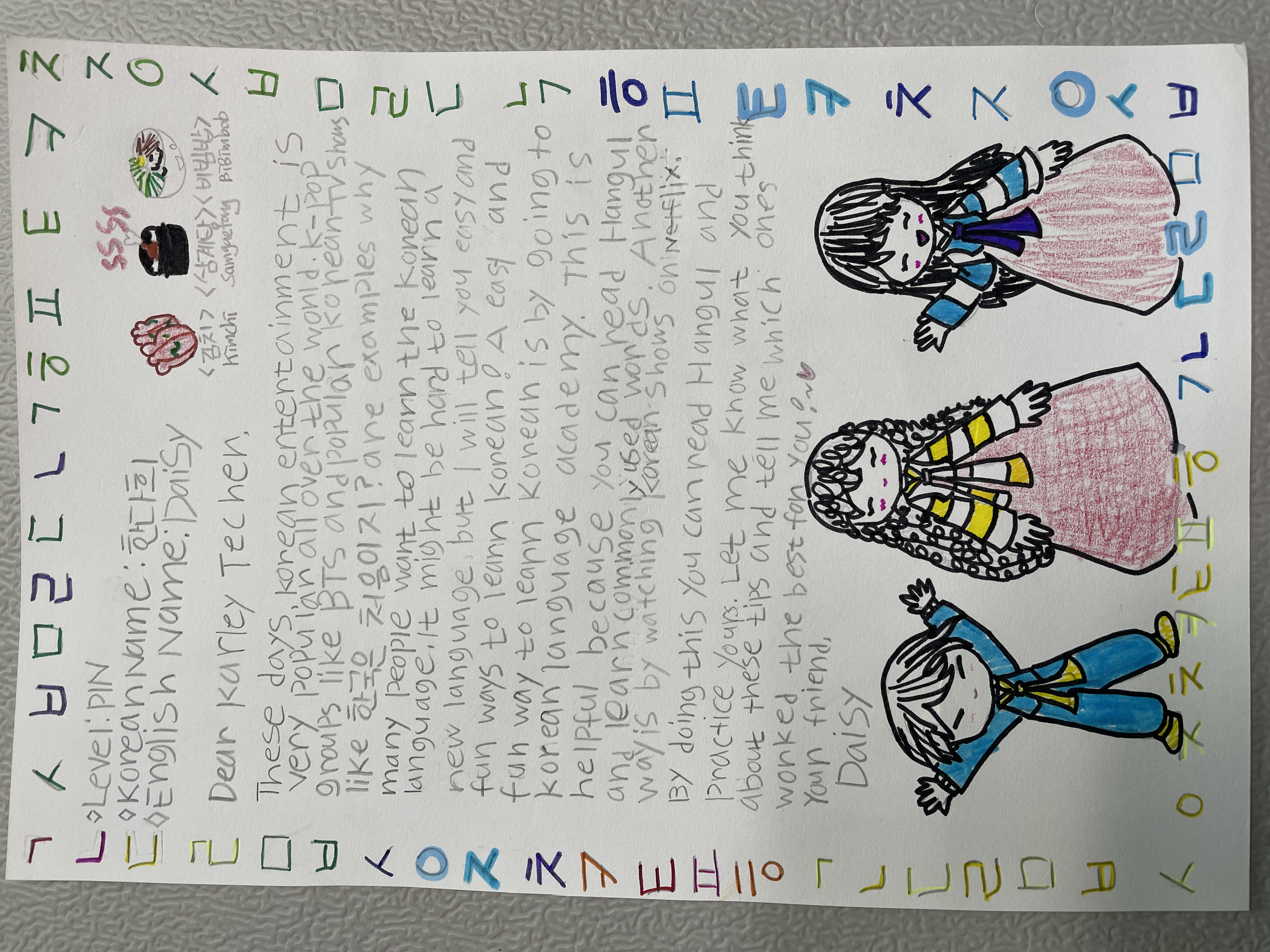 작성자이매랭콘 AliciaT 작성시간 21.10.13 Daisy! 드림레터 너무 예쁘다!! 한복입은 친구들도 귀엽고 드림레터 테두리를 한글로 꾸민것도 너무 멋있어요^^ 깔끔한 글씨로 한국 프로그램 보면서 배우면 좋겠다는 아이디어가 너무 좋은데요? 멋진 드림레터 작성하느라 수고했어~