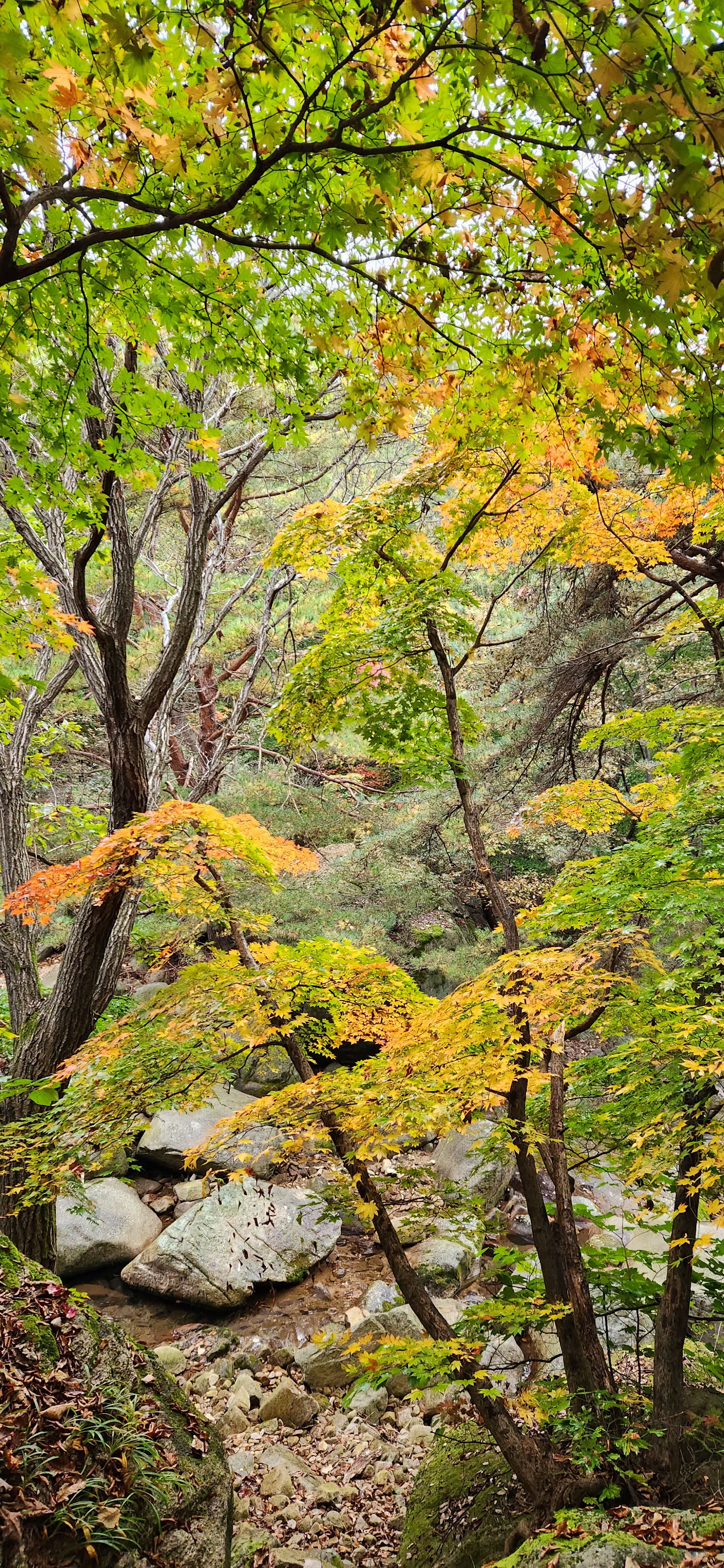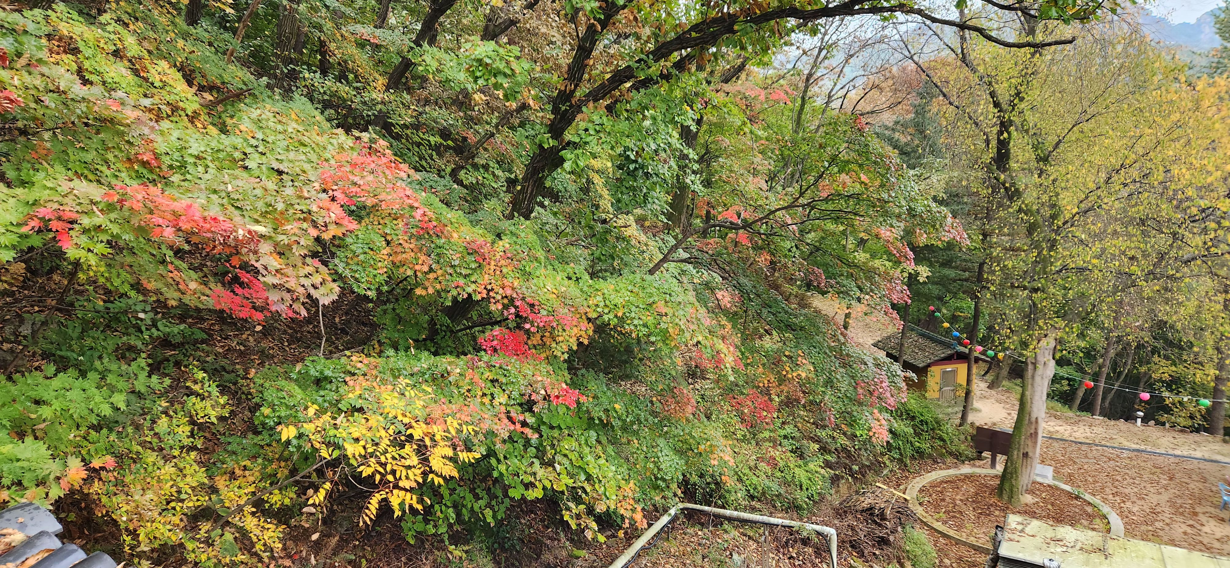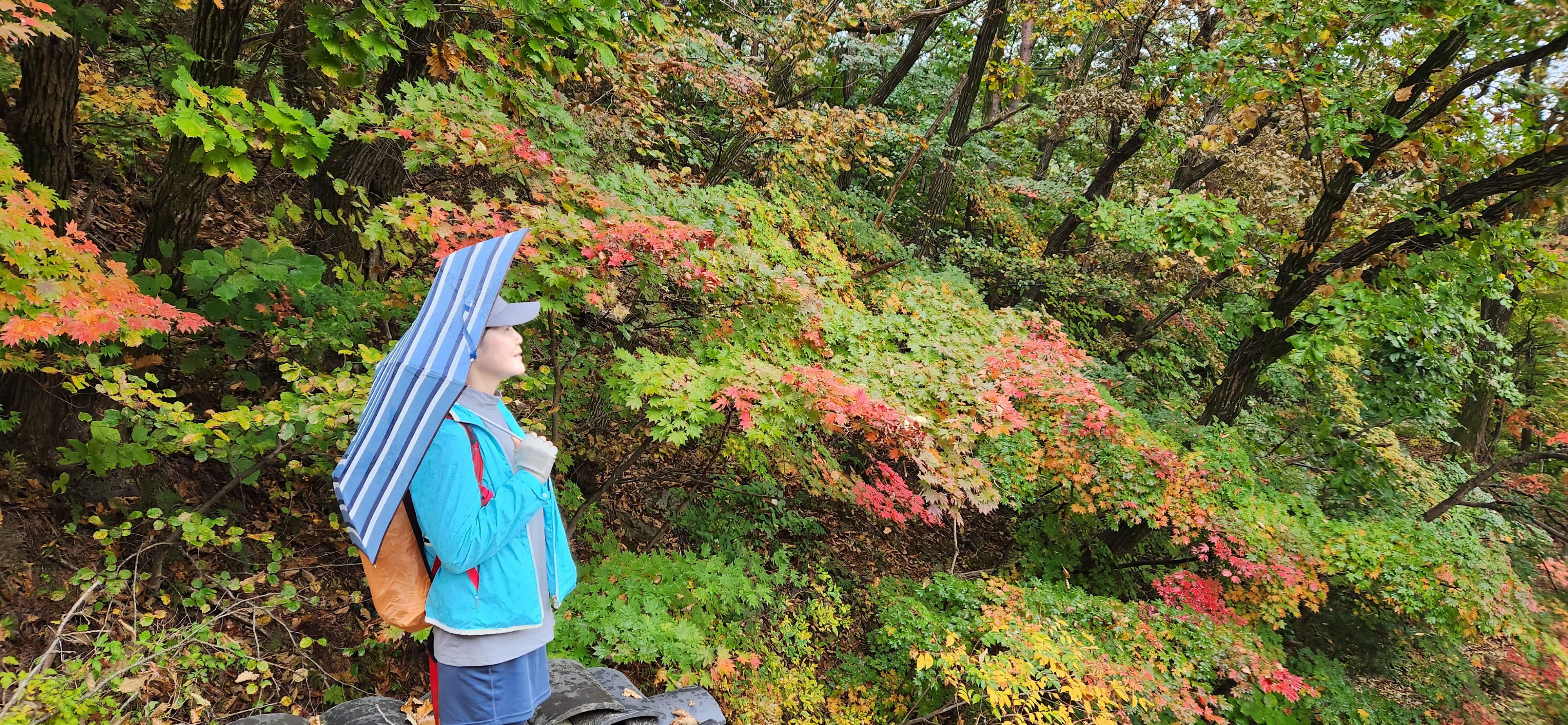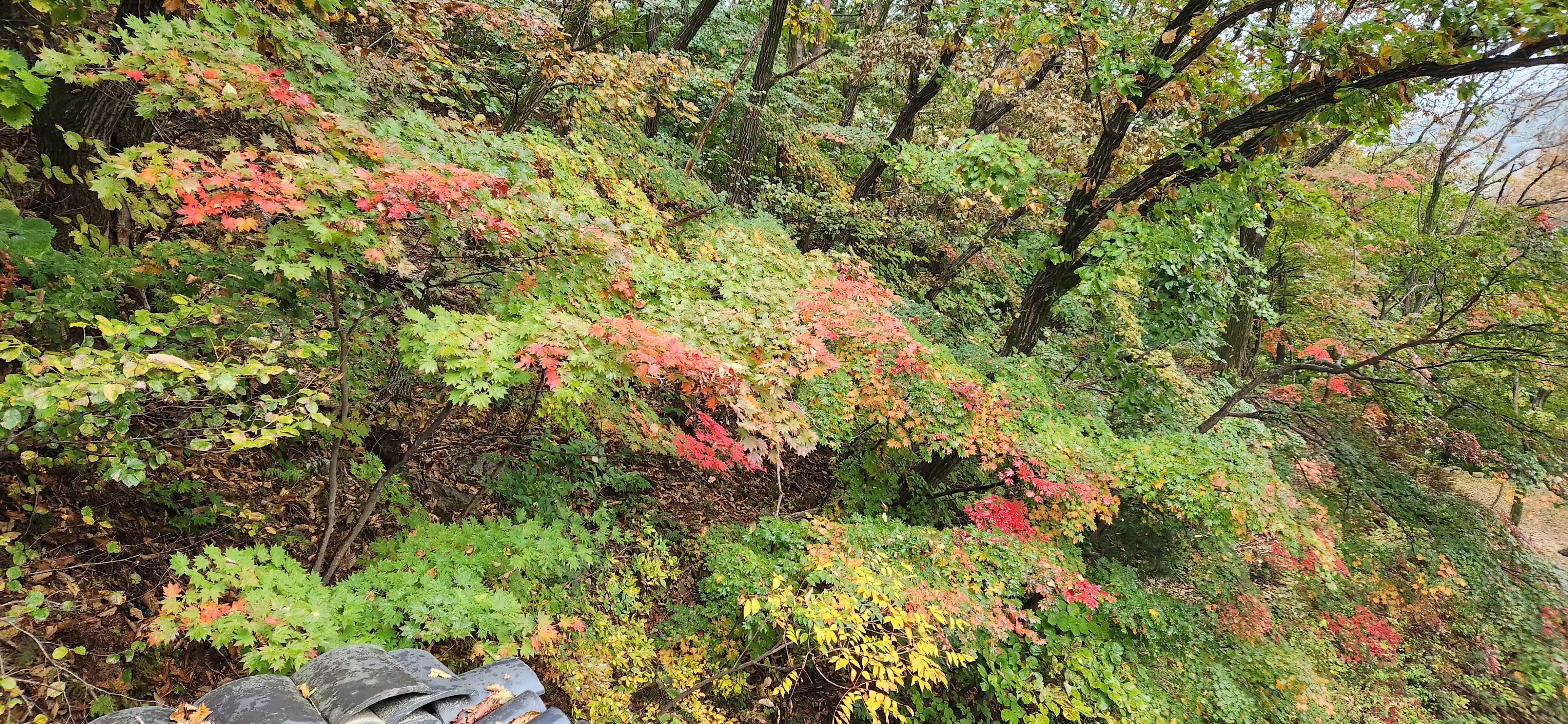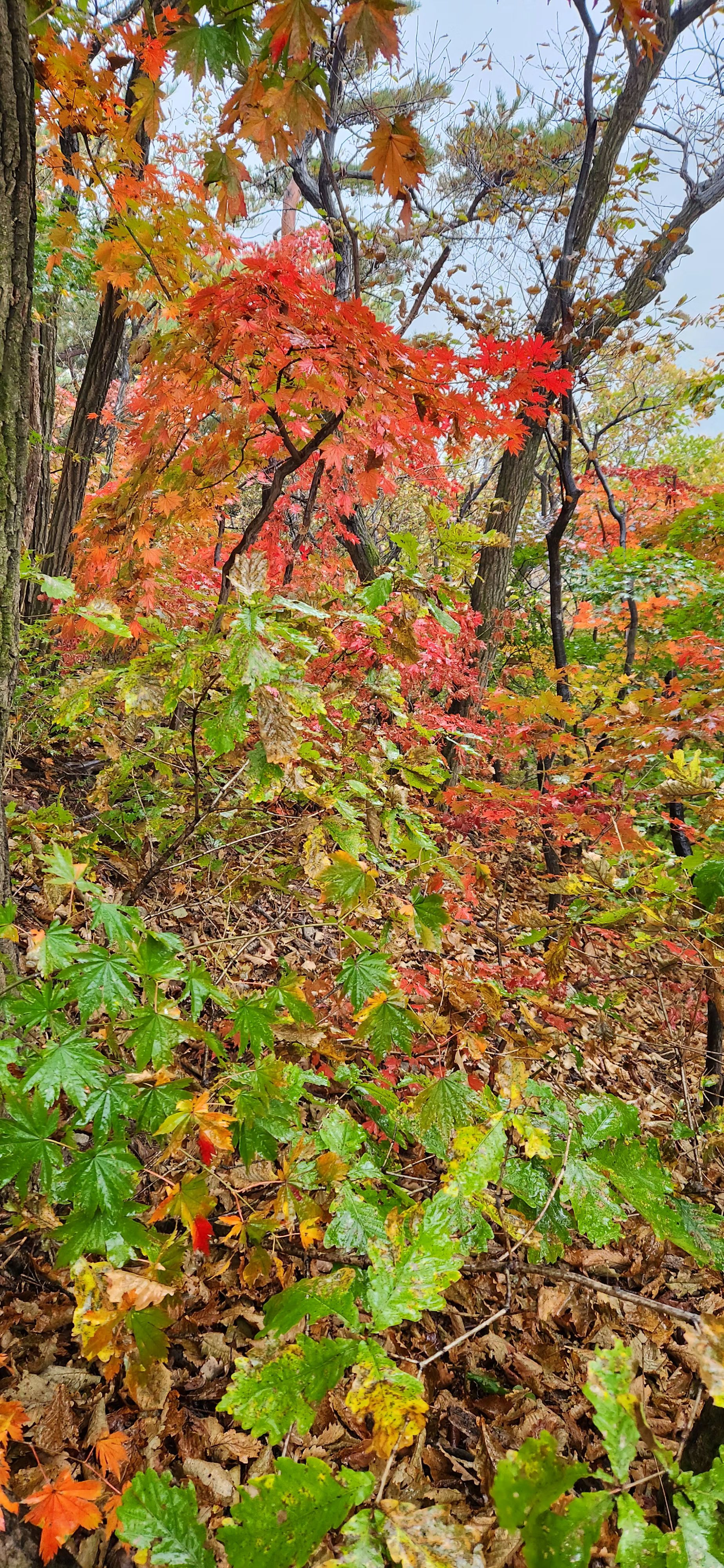빗속을 걷는 일도 이제는 행복하다. 산행할 때 비는 언제나 귀찮고 반갑지 않은 손님이었는데, 지금은 흔쾌히 비와 더불어 흐를 수 있다. 흐르는 것이 어디 비뿐이랴. 세상 모두가 끊임없이 흐른다. 바지가 젖고 등산화 속은 물이 차서 질퍽거려도, 산이 연출하는 가을숲의 교향곡은 오히려 머릿속을 맑게 한다. 빗물 속에 드러나는 단풍잎처럼ᆢ. 한 해의 고락(苦樂)을 잎에 새기는 단풍을 보면서 '나의 빛은 어떨까' 自問해 본다. 길에 떨어진 어떤 잎은 푸른 채 마른 것, 또 어떤 잎은 반쯤 물든 것, 또 다른 것은 엷은 갈색 ᆢ. 우리네 인간도 인생의 황혼기에는 곱디고운 단풍처럼 물드는 것을 보고 싶다. 나와 우리 공동체의 삶에 최선을 다한 후 드러나는 빛깔이라면 그것이 갈색이든 붉은색이든 어찌 곱지 않을까?
