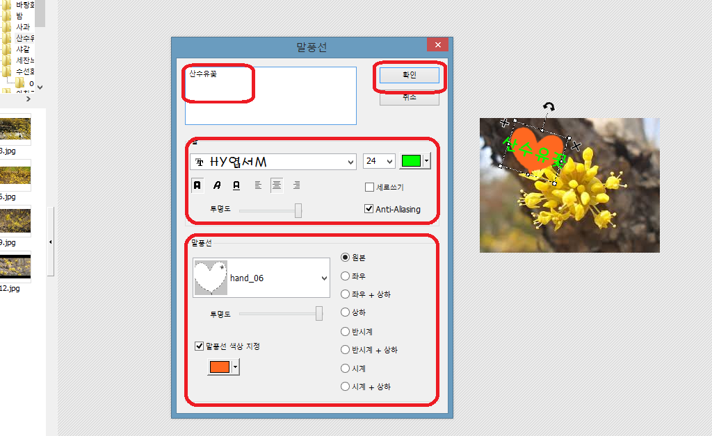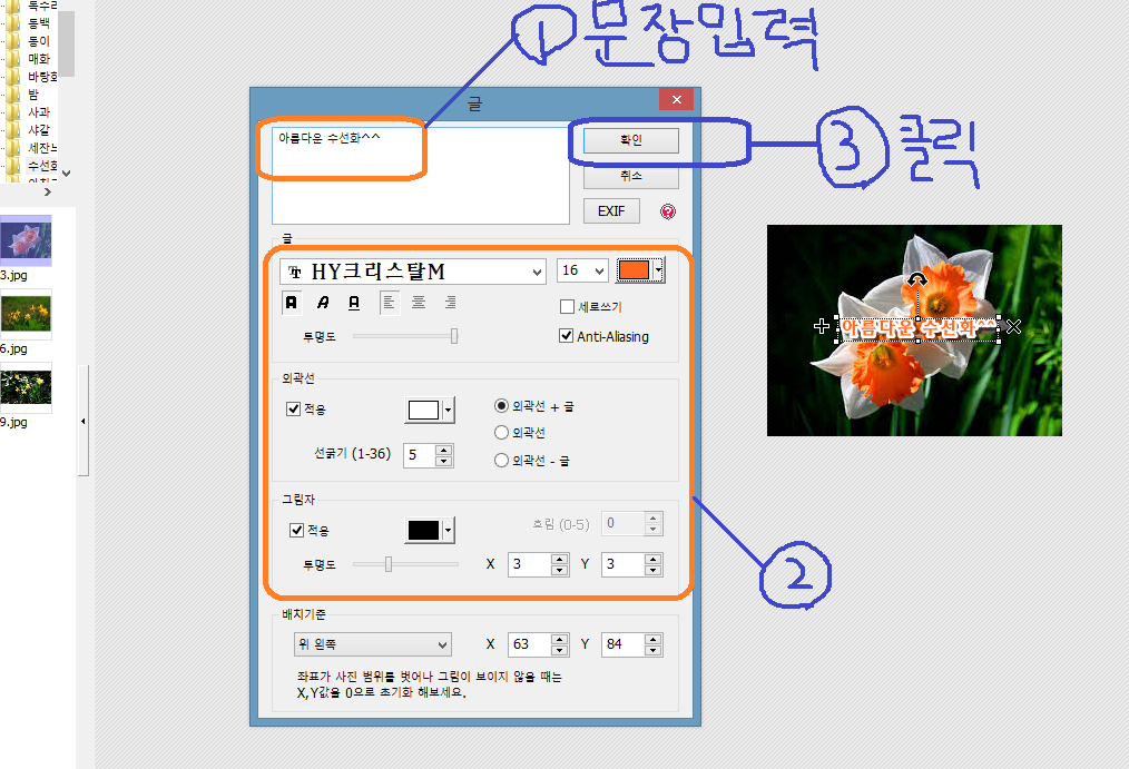 ③ [글] 대화상자가 나타나면, 문장 입력(‘아름다운 수선화’)하고, 글꼴, 글자색 등을 편집한다.
