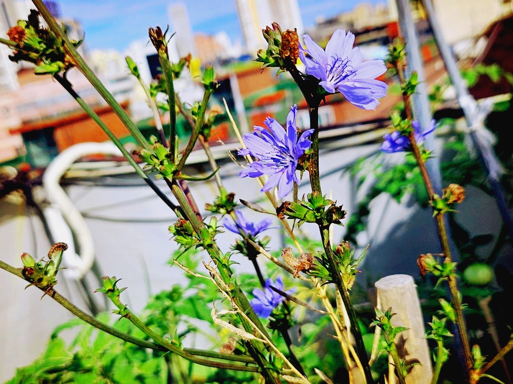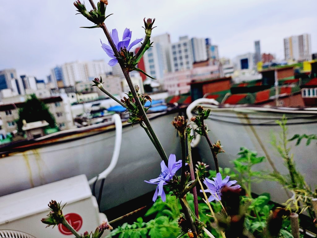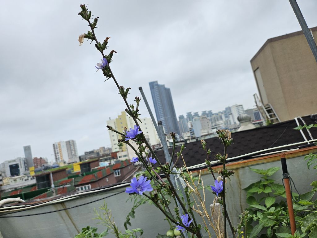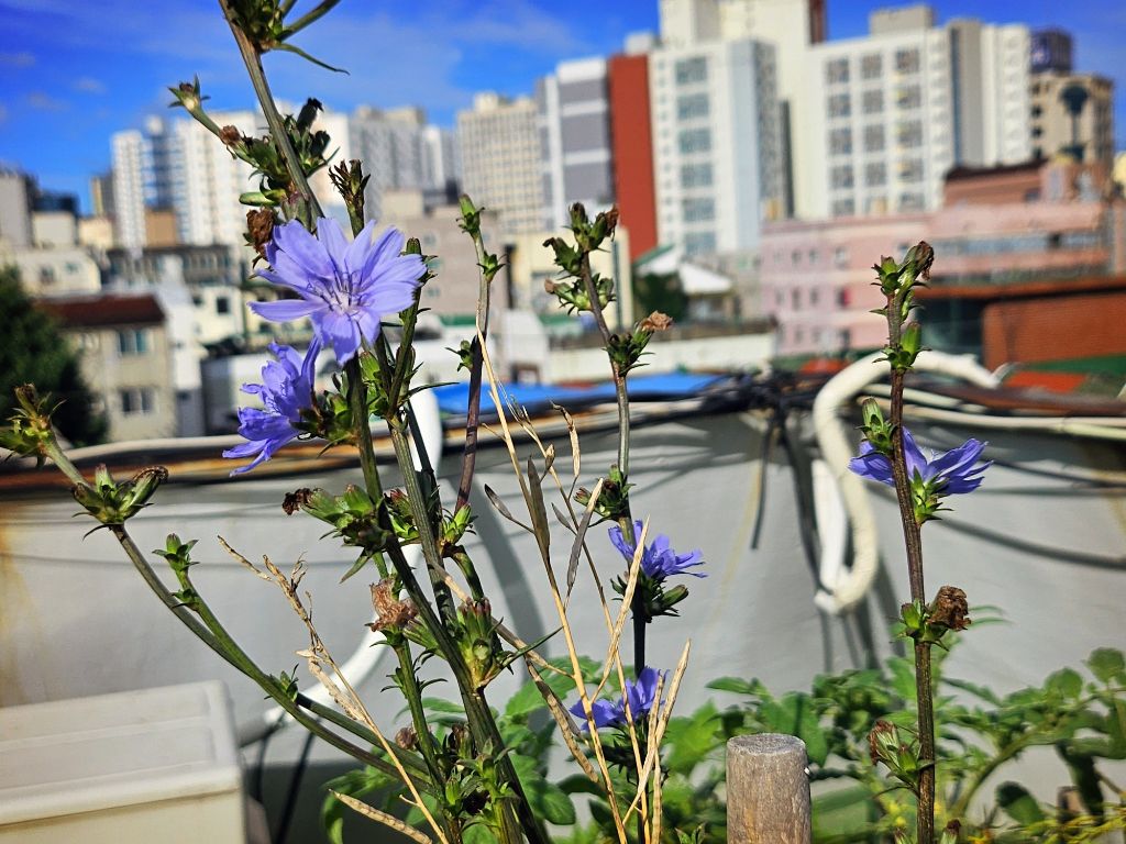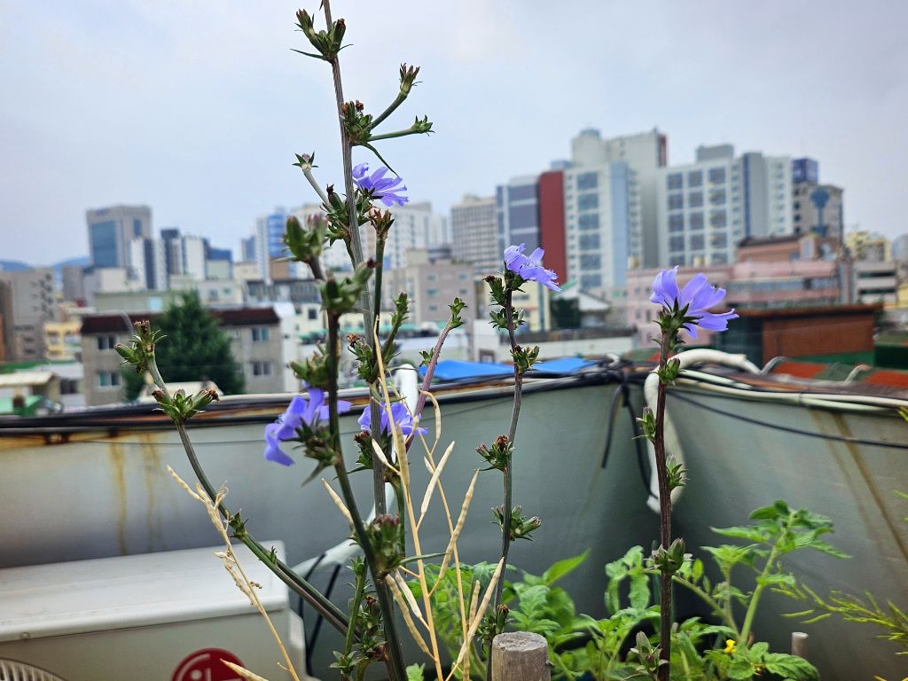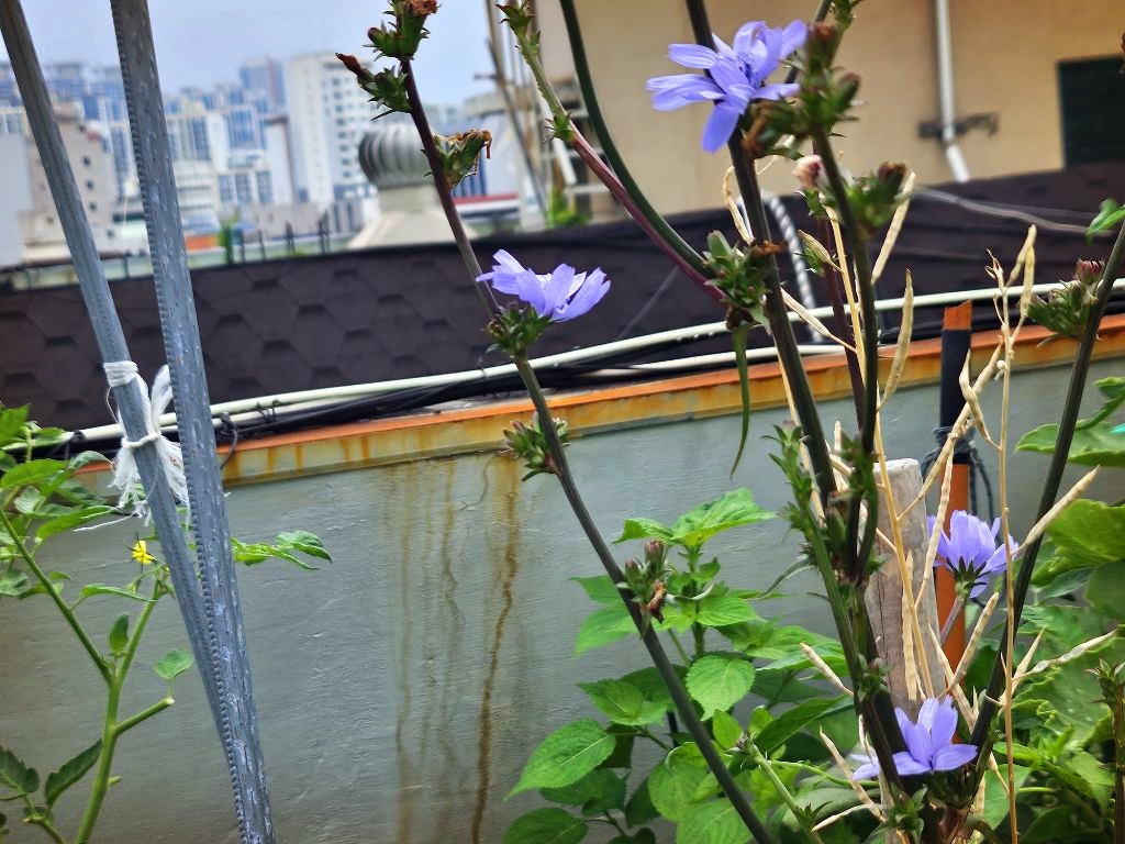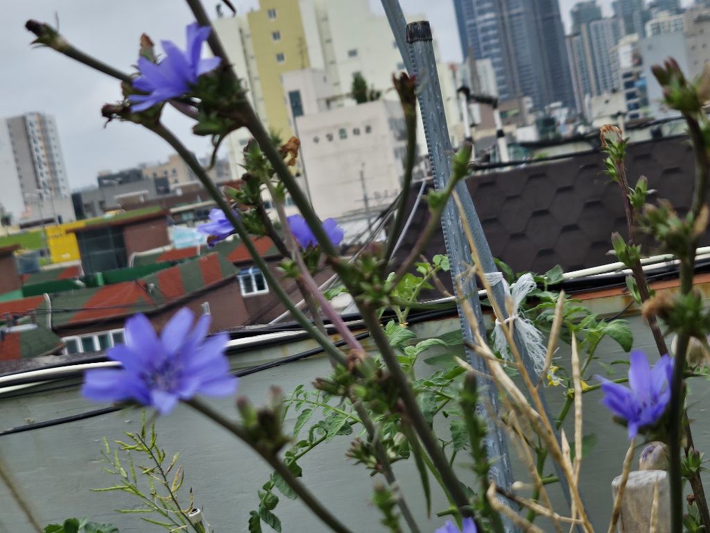 옥상 텃밭에 핀 치커리 꽃입니다.