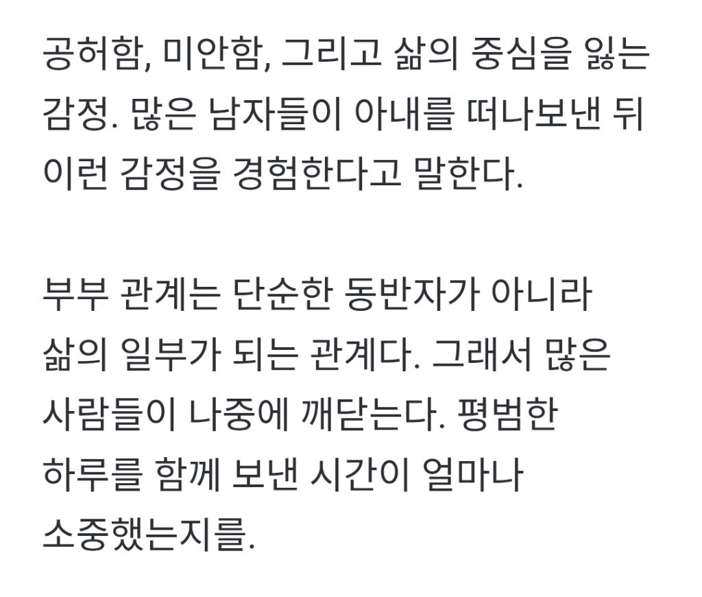 아내가 먼저 떠났을때 홀로된 남자는? 작성자거수남|작성시간26.04.04|조회수170 목록 댓글 1 글자크기 작게가 글자크기 크게가 다음검색 현재 게시글 추가 기능 열기 북마크 신고 센터로 신고 댓글 댓글 1 댓글쓰기 답글쓰기 댓글 리스트 작성자야생화다 | 작성시간 07:33 new 정확한 글 이네요현재 내가 이 상태 댓글 전체보기