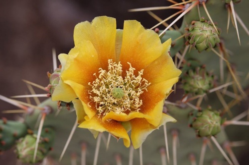 노팔 선인장은 멕시코 전역과 미국 남서부 사막 지역에서 흔하게 볼 수 있는 선인장의 일종으로, 학명은 ‘오푼티아 피쿠스 인디카 (Opuntia ficus-indica)’이며, 멕시코에서는 ‘노팔’로, 미국에서는 ‘프리클리 페어 (prickly pear)’로도 부르고 ‘인디안 피그 오푼티아 (Indian fig opuntia)’로도 부릅니다. 이름을 번역하는 것이 마땅치 않지만 ‘프리클리 페어’를 굳이 번역한다면 ‘가시투성이 배’ 쯤 되겠어요.
