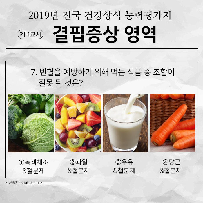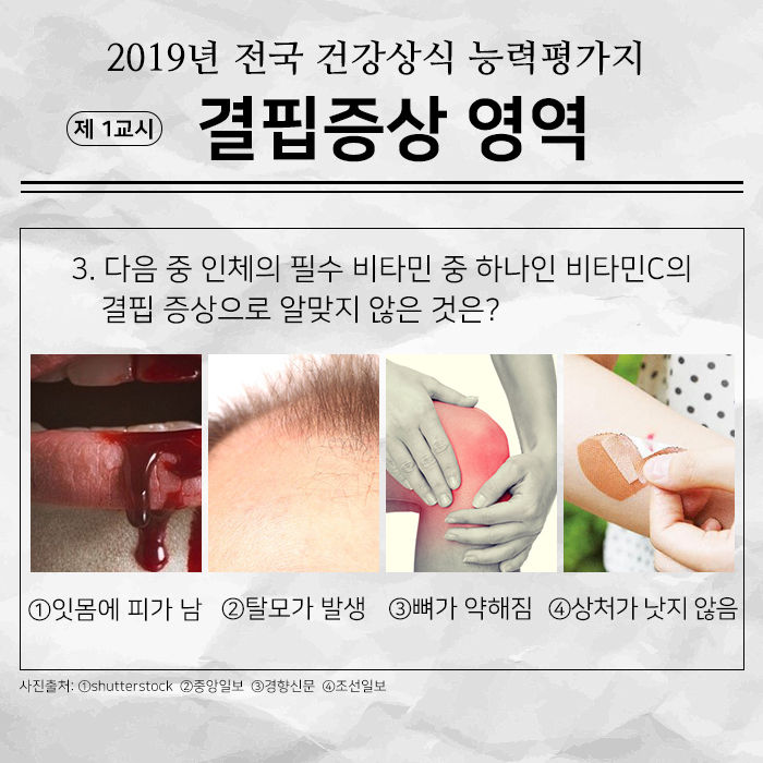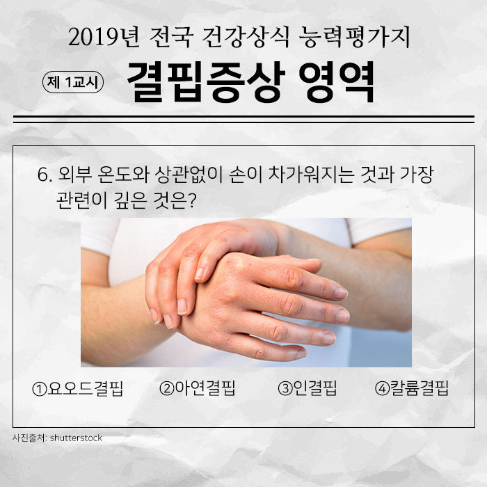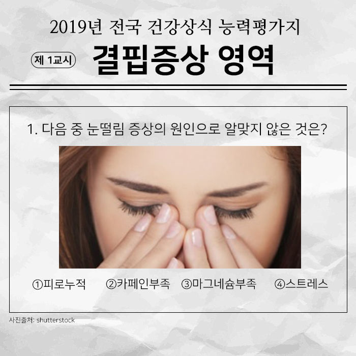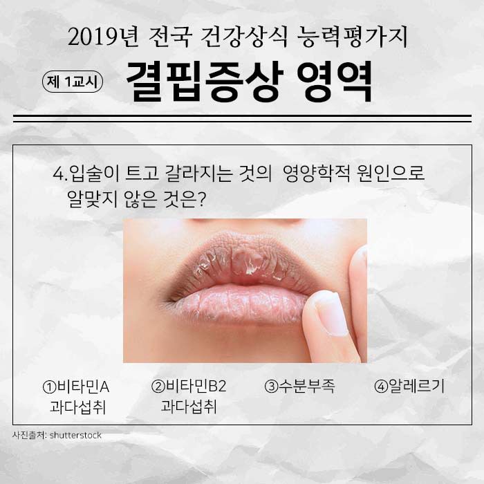 몸에 무언가 부족할 때면 나타나는 특이한 신체증상 작성자향기있는사람|작성시간19.02.05|조회수145 목록 댓글 2 글자크기 작게가 글자크기 크게가 몸에 무언가 부족할 때면 나타나는 특이한 신체증상 갑자기 떨리는 눈꺼풀, 사라지지 않는 입 냄새 그 원인은 질병을 알리는 우리 몸의 신호일 수 있는데요. 결핍 찾아오는 몸의 증상에 대한 온 가족 건강 지키는 결핍 증상 퀴즈 풀어볼까요? 15,165명이 참여하였습니다.눈 떨림 현상은 피로 누적, 카페인 과다섭취, 마그네슘 부족, 스트레스 등으로 발생한다피로누적 카페인부족 :마그네슘부족비타민A의 결핍은 야맹증, 안구건조증, 각막연화증 등 눈의 이상을 유발한다.건강 Tip: 비타민A는 동물의 간이나, 달걀, 버터 등에 많이 함유되어 있으며 붉은 고추, 당근, 호박 등 채소와 과일 등에도 비타민A로 전환될 수 있는 전구체인 베타-카로틴 형태로 포함되어 있다.비타민A비타민B비타민C비타민E뼈가 약해지는 증상은 주로 비타민D의 결핍과 관련이 있다.건강 Tip: 비타민C 섭취는 혈류와 세포 성장을 증가시키는데 도움을 준다. 급원 식품으로는 오렌지나 딸기, 키위 같은 과일이나 피망, 고추, 브로콜리 등의 녹색 채소가 있다.잇몸에 피가 남탈모 발생뼈가 약해짐상처가 낫지 않음입술 각질은 비타민B2(리보플라빈)이 부족했을 때 생기는 신체적 증상이다. 비타민A 과다섭취, 수분부족, 알레르기도 입술에 각질이 생기는 증상의 원인이다.비타민A 과다섭취비타민B2 과다섭취수면부족알레르기탈모, 건조한 피부, 약한 손톱은 콜라겐과 관련 있기 때문에 단백질 부족 시 일어나는 증상이다.입냄새피로두통탈모갑상선 기능 저하를 일으키는 요오드 결핍으로 생길 수 있는 증상이다.건강 Tip: 요오드 급원 식품으로는 대표적으로 김, 파래 등의 해조류가 있다. 요거트나 우유, 닭고기, 생선, 달걀 등도 요오드의 급원 식품이다.요오드결핍아연결핍인결핍칼륨결핍우유에 다량 함유된 칼슘은 철분 흡수를 방해하여 빈혈을 유발할 수 있기 때문에 함께 섭취하는 것은 좋지 않다.녹색채소&철분제과일&철분제우유&철분제당근&철분제3초 안에 본능적으로 풀어야 하는 창의력 퀴즈모음! 다음검색 현재 게시글 추가 기능 열기 북마크 신고 센터로 신고 댓글 댓글 2 댓글쓰기 답글쓰기 댓글 리스트 작성자해아림 | 작성시간 19.02.05 이미지 확대 작성자강화인 | 작성시간 19.02.05 좋은정보. 감사합니다.건강하세요^^ 댓글 전체보기