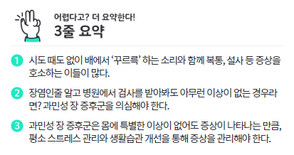 툭하면 복통과 설사, 혹시 나도 과민성 장 증후군? 복통, 설사하는데 장염 아니라면 과민성 장 증후군을 의심해야 한다...! 하... 나 요즘 툭하면 배 아프고, 설사해서 너무 괴로워ㅠ 썰리엥? 어디 아픈거 아니야? 썰리시도 때도 없이 배에서 '꾸르륵' 소리나고 이상해서 장염인줄 알고 검사받아 봤거든? 근데 아무 이상이 없다는거야... ![]() 썰리혹시 그거 과민성 장 증후군 아니야? 썰리복통과 설사 증상이 있는데 병원에서 검사를 받아봐도 아무런 이상이 없으면 썰리과민성 장 증후군을 의심해봐야 한대! 썰리아 정말? ![]() 썰리응 과민성 장 증후군이 대장내시경 등 각종 검사에서 특별한 질환이 없다고 나오는데 썰리복부팽만감, 복부불편감, 복통, 설사, 변비 등 배변 습관의 변화가 나타나는 썰리대표적 만성 기능성 위장관 질환 중 하나래. 썰리헐... 나랑 증상이 많이 겹치네? 나 과민성 장 증후군인가...? ![]() 썰리전 세계적으로 인종, 나이, 성별에 관계없이 흔한 질환이고 썰리세계적으로 약 7~8%가 질환을 앓고 있고 우리나라는 최근 6.6%가 겪고있대. 썰리나같은 사람들이 꽤 있구나... ![]() ![]() 썰리 원래 40~60대 성인에서 흔히 발견하는데 썰리요즘은 전 연령으로 확산되는 추세래. 썰리연령대별 환자수를 보면 2014년부터 썰리20대 이상 연령층 환자수가 점점 늘어나고 있는걸 볼 수 있어. 썰리진짜 그러네? 20대부터 점점 증가하는구나. 근데 이게 진짜 너무 괴로워ㅠㅜ 왜 이러는지 원인을 알면 좀 해결될텐데...ㅠ ![]() 썰리원인은 아직 명확히 밝혀지지 않지만 썰리장의 운동 이상, 스트레스, 자극적인 식사 등이 영향을 미치는 것으로 추정된대. 썰리![]() 흠... 자극적인 식사... 너무 찔리는데? 맨날 엽떡 먹고 사이다 먹고...ㅋㅋ ![]() 썰리전문가의 말에 따르면 어릴 때는 썰리부모님이 고른 영양을 섭취할 수 있도록 도와주고 큰 스트레스도 없지만, 썰리커가면서 점차 식사도 서구화 되고 썰리본격적으로 학업을 시작하는 10대부터는 스트레스도 받으니까... 썰리이런 요인들이 원인일 수 있대. 썰리그렇구나 흠... 이제 건강하게 잘 챙겨먹어야겠네. 근데 과민성 장 증후군이 위험한 질환이야? 썰리생명을 직접 위협하는 건 아니지만, 수시로 복통이나 설사가 발생하니까 썰리일상생활에 심각한 지장을 주고 삶의 질을 떨어뜨릴 수 있지. ![]() 썰리 맞아ㅠㅜ 진짜 삶의 질이 떨어져. 어디가도 화장실부터 찾게되고... 언제 배가 아플지 모르니까 항상 긴장 상태야ㅠㅜ ![]() 썰리힘들겠다ㅠ 병원 가서 약 처방 받으면 나으려나? 썰리아직 완치시킬 수 있는 치료제는 따로 없어서 호소하는 증상에 따라 약이 처방된대. 헐... 치료제가 없다니...ㅠㅜ ![]() 썰리대신 과민성 장 증후군은 장에 특별한 질환이 있는 상태는 아니니까 썰리평소에 생활습관을 개선해서 예방하는게 중요해. 썰리어떻게? 썰리겨울에도 아이스 커피보다는 따뜻한 커피를 마시고 ![]() 썰리 찬 물보다는 미지근한 물을 마시는게 좋아. 썰리![]() 미지근한 물을 먹어야하는구나! 음식은 어떤 걸 먹는게 좋아? ![]() 썰리'마'가 오랜 소화기 증상으로 저하된 기능을 회복하는데 좋고 설사 증상도 개선해준대. 썰리![]() 썰리'다시마'도 섬유소가 많아서 변비 개선과 부종 제거, 염증을 가라앉히는 효능이 있대. 썰리![]() 마랑 다시마가 과민성 장 증후군에 좋구나. ![]() 썰리ㅇㅇ 그리고 과민성 장 증후군에 도움되는 마사지 법도 있으니까 썰리틈날 때마다 하는것도 좋을 것 같아. 썰리오홍 배를 따듯하게 해주면서 저 부위를 가볍게 지압하거나 마사지하면 좋다는거지? ![]() 썰리 응응 오케 우선 병원에도 가보고 생활 습관 바꾸는 걸 시작해야겠다! ![]() 썰리 그래그래 건강이 젤 중요해! ![]() 썰리 ![]()