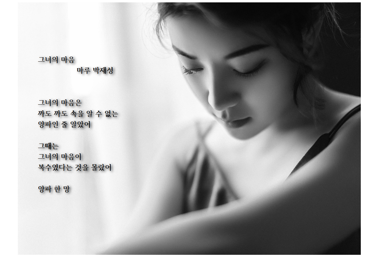 그녀의 마음 작성자마루 박재성|작성시간24.06.20|조회수167 목록 댓글 1 글자크기 작게가 글자크기 크게가 그녀의 마음 마루 박재성 그녀의 마음은 까도 까도 속을 알 수 없는 양파인 줄 알았어 그때는 그녀의 마음이 복수였다는 것을 몰랐어 양파 한 망 다음검색 현재 게시글 추가 기능 열기 북마크 공유하기 신고 센터로 신고 댓글 댓글 1 댓글쓰기 답글쓰기 댓글 리스트 작성자마루 박재성 작성자 본인 여부 작성자 | 작성시간 24.06.20 그녀의 마음 마루 박재성그녀의 마음은까도 까도 속을 알 수 없는양파인 줄 알았어그때는그녀의 마음이복수였다는 것을 몰랐어양파 한 망 댓글 전체보기