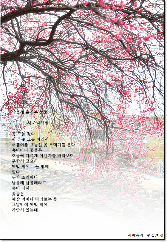 남물래 흘리는 눈물 / 나해철 작성자풍경소리^^|작성시간26.04.01|조회수81 목록 댓글 1 글자크기 작게가 글자크기 크게가 사진작품 / 사람풍경 다음검색 현재 게시글 추가 기능 열기 북마크 공유하기 신고 센터로 신고 댓글 댓글 1 댓글쓰기 답글쓰기 댓글 리스트 작성자풍경소리^^ 작성자 본인 여부 작성자 | 작성시간 26.04.01 💮늘 고마운좋은 친구님오늘도덕분에 미소지으며하루를 시작합니다오늘의 좋은 기운이듬뿍 스며들어행복한 마음으로기쁘고 즐겁게보내세요.🦋 댓글 전체보기 맨위로 카페 검색 취소 카페 검색어 입력폼 검색 검색어 지우기