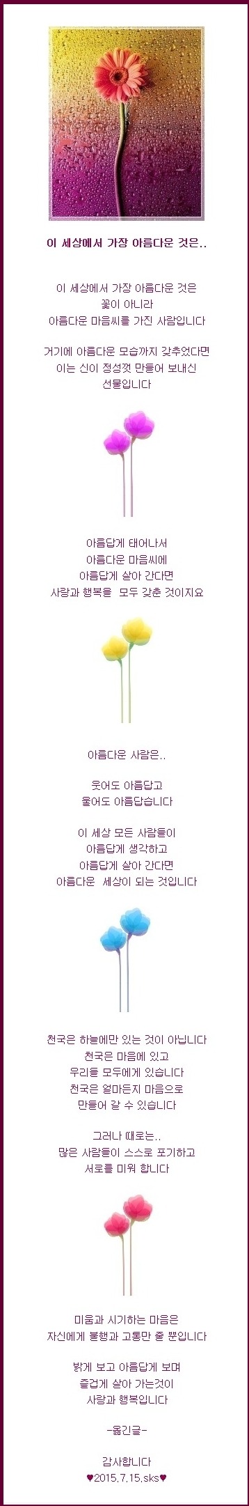 이 세상에서 가장 아름다운 것은.. 작성자청바위|작성시간15.07.15|조회수2,106 목록 댓글 5 글자크기 작게가 글자크기 크게가 다음검색 현재 게시글 추가 기능 열기 북마크 공유하기 신고 센터로 신고 댓글 댓글 5 댓글쓰기 답글쓰기 댓글 리스트 작성자자현심 | 작성시간 15.07.15 고맙습니다 작성자happyend | 작성시간 15.07.15 가슴에 새겨야 할 좋은 글이네요.감사합니다. 작성자한나무 | 작성시간 15.07.15 산을 사랑하는 사람은 아름다운 마음을 가진 사람이다. 그들은 이웃을 사랑할 줄도 안다. 작성자비전을 꿈꾸며 | 작성시간 15.07.15 좋은글 감사합니다~~~^^ 작성자뚱짜 | 작성시간 15.07.15 좋은글에 기대어 봅니다 고마워요 댓글 전체보기
