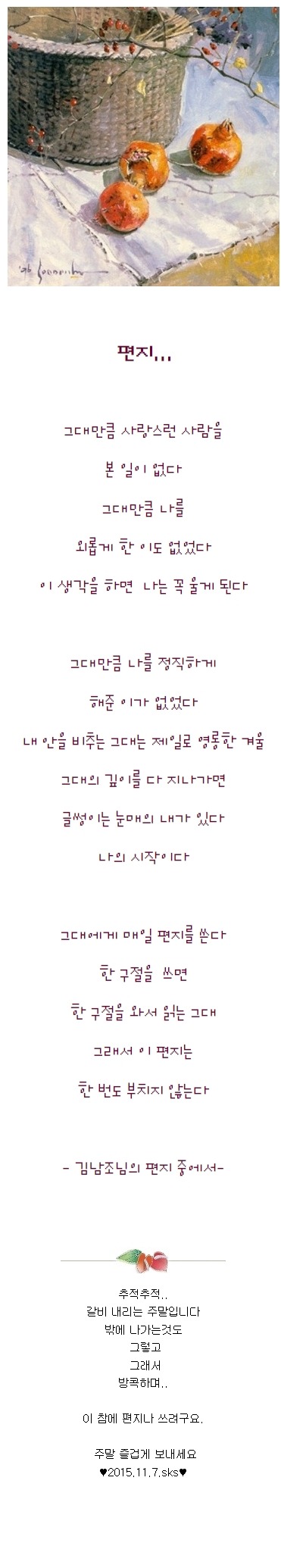 편지..../김남조 작성자청바위|작성시간15.11.07|조회수863 목록 댓글 1 글자크기 작게가 글자크기 크게가 다음검색 현재 게시글 추가 기능 열기 북마크 공유하기 신고 센터로 신고 댓글 댓글 1 댓글쓰기 답글쓰기 댓글 리스트 작성자영롱이 | 작성시간 15.11.07 새콤달콤한 석류이미지...사랑스럽고 예쁜 편지지와 글향에 흠뻑 젖었네요...예쁜글 담아갑니다.. 포근한 오늘되셔요^^♡ 댓글 전체보기