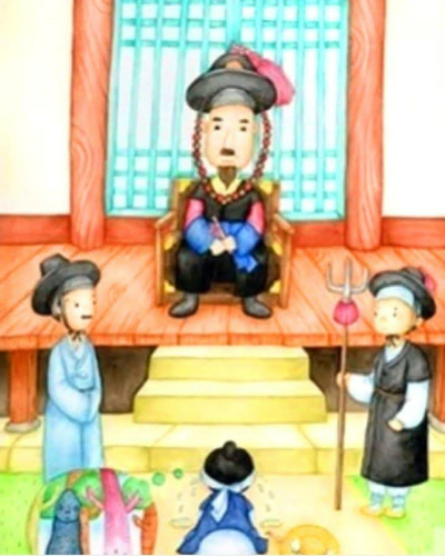 하인이 바가지에다 물을 퍼와서는 원님에게 또 끼얹었다.