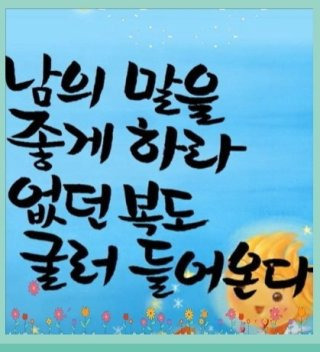 복을 부르는 인생명언들 1. 웃음으로 시작하고 웃음으로 마감하라. 여기가 천국이다. 2. 기쁨으로 수용하라. 기뻐하면 기뻐할 일만 생겨난다. 3. 힘든 것에는 뜻이 있다. 감사함으로 수용하라. 4. 믿음의 열도를 10배로 늘여라. 긍정적 생각이 100배의 수확이 보장된다. 5. 모두를 위하는 사람이 되라. 배려와 겸손, 그것이 나를 위하는 지름길이다. 6. 진리가 아니면 따르지 말라. 참 삶의 길을 가라. 길 한번 잘못 들면 평생 후회한다. 7. 인연을 소중히 하라. 인연 중에 소중하지 않은 인연은 없다 8. 내 인생 드라마는 스스로 연출한다. 명연기를 보여주라. 9. 건강해야 건강한 운을 만든다. 몸과 마음이 건강하게 살라. 과욕을 버려라. 10. 잠에서 깨어나라. 그래야 지혜의 눈을 크게 뜰 수 있다. 11. 하늘은 스스로 돕는 자를 돕는다. 하늘이 좋아하는 자가 되라. 12. 지혜로운 사람이 되라. 어리석은 사람은 길을 두고 모로 간다. 13. 자신의 무한 능력을 발견하라. 숨은 잠재능력을 깨워라. 복된 나날이 펼쳐진다. 14. 머리를 써라. 머리는 하늘이 나에게 준 보물창고다. 15. 실패를 뒤집어보라. 그 속에 성공이 들어있다. 16. 아낌없이 베풀어라. 샘물은 퍼낼수록 맑은 물이 솟아난다. 17. 자신의 눈을 믿지 말라. 남의 눈으로 자신을 바라보라. 18. 최대의 기쁨으로 하루를 맞이하라. 살아있는 날은 경축일이다. 19. 먼저 부모를 공경하라. 자손대대로 번영한다. 20. 눈앞의 문제에 집착하지 말라. 문제 뒤에 해답을 찾아내라. 21. 나날이 향상하라. 향상하지 않으면 퇴보한다. 22. 남의 말을 좋게 하라. 없던 복도 굴러온다. 23. 음식만 골라 먹지 말라. 말도 골라서 하라. 24. 복을 많이 지어라. 내가 지은 것만이 내 것이 된다. 25. 복을 달라고 안달하지 말라. 복을 담을 그릇을 먼저 만들어라 - '복 받고 살아가는 방법'에서- |