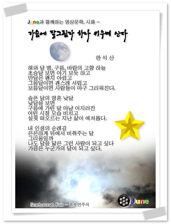 가슴에 달그림자 하나 키우며 산다 - 한석산 작성자해와달(오월)|작성시간24.03.21|조회수105 목록 댓글 0 글자크기 작게가 글자크기 크게가 다음검색 현재 게시글 추가 기능 열기 북마크 신고 센터로 신고 댓글 댓글 0 댓글쓰기 답글쓰기 댓글 리스트