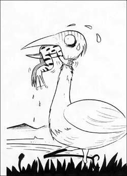 황새에게 머리부터 잡혀 먹히게 된 개구리가절체절명의 순간에도 끝까지 포기하지 않고 죽을 힘을 다 해 황새의 목을 조르고 있는 이 한 컷 짜리 유머러스한 그림은