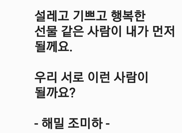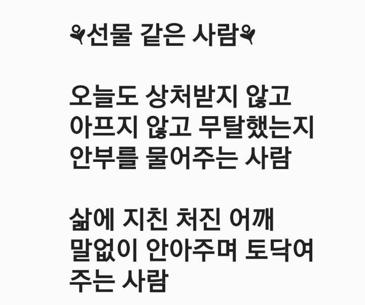 선물 같은 사람 작성자무궁화|작성시간22.06.04|조회수1,065 목록 댓글 4 글자크기 작게가 글자크기 크게가 🌰글/ 조미하🌰🔰편집 : 무궁화🔰 다음검색 현재 게시글 추가 기능 열기 북마크 공유하기 신고 센터로 신고 댓글 댓글 4 댓글쓰기 답글쓰기 댓글 리스트 작성자박종해 | 작성시간 22.06.04 설레고 기쁘고 행복한 선물같은 사람이 저도 먼저 되고 싶습니다.감사합니다. 이미지 확대 답댓글 작성자무궁화 작성자 본인 여부 작성자 | 작성시간 22.06.04 박종해님!!안녕하세요.좋은 일만 가득하시길 소망합니다.늘 건강하시고요.감사합다 이미지 확대 작성자한결같이요 | 작성시간 22.06.04 고맙습니다 답댓글 작성자무궁화 작성자 본인 여부 작성자 | 작성시간 22.06.04 한결같이요님!!오늘 하루도 져물었네요.오늘 고생하셨습니다행복한 쉼되세요.감사합니다. 이미지 확대 댓글 전체보기