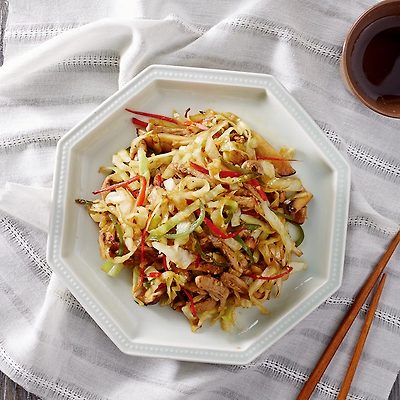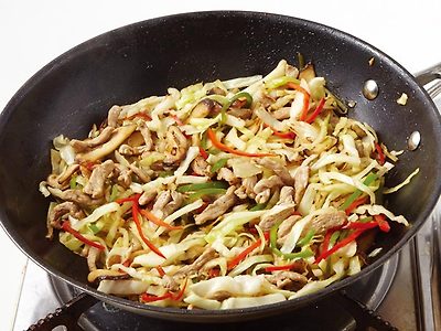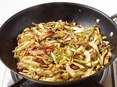 3. 센 불로 달군 팬에 식용유(2)를 두른 뒤 고기→표고 버섯→양배추→고추 순으로 넣어 볶고,