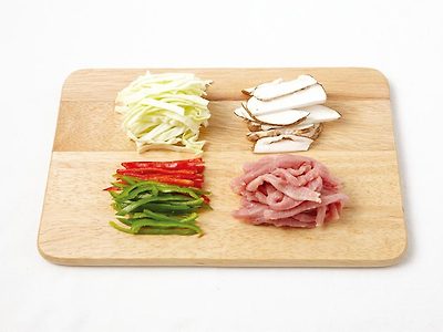 2. 양배추, 표고버섯, 고추, 돼지고기 안심은 얇게 채 썰고,