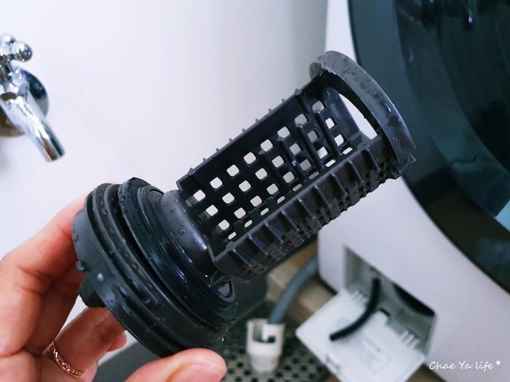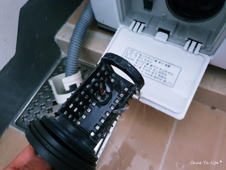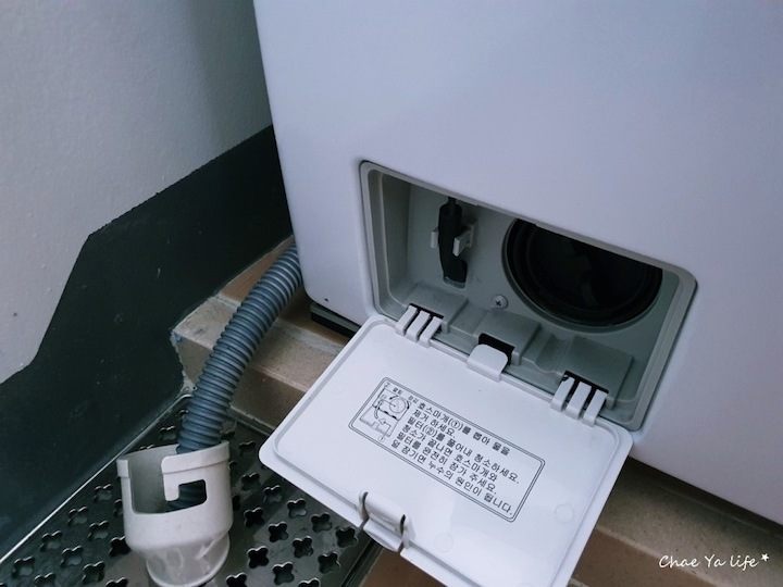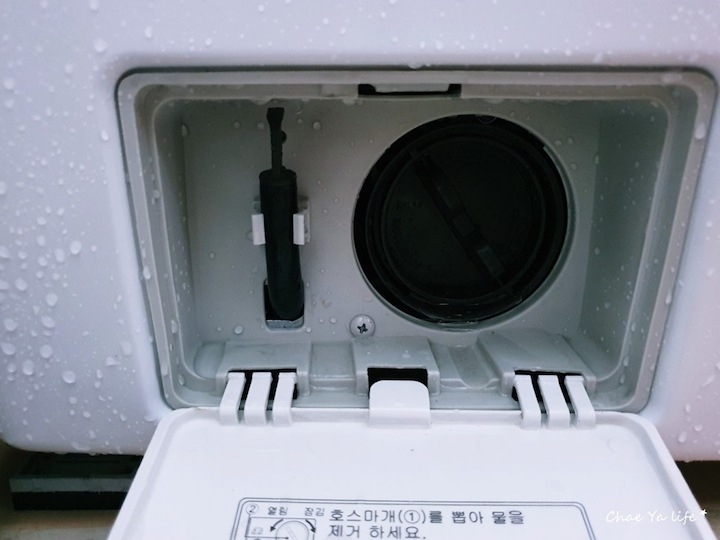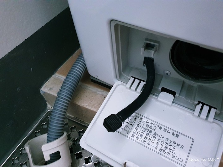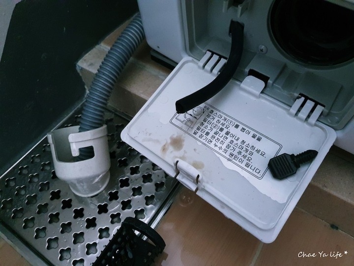 호스 마개를 빼서 물을 빼주고 일반 세탁기에 먼지 통 기능을 하는 필터를 빼주어