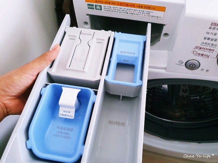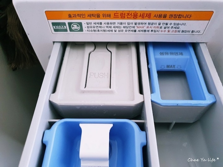 세제 투입구는 PUSH 버튼을 눌러서 서랍 열듯이 잡아당겨 주면서 빼주세요.