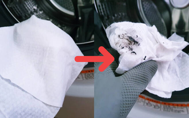 2) 섬유 찌꺼기가 가득한 패킹 물티슈로 청소하기
