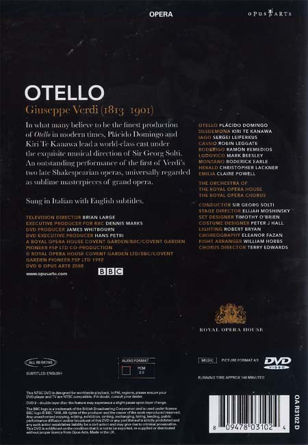 그러나 본 영상물의 가치는 도밍고에게만 있지 않다. 데스데모나를 부른 키리 테 카나와는 그녀의 모든 영상자료 중에서 가장 어울리는 적역을 만난 듯 보인다. 절대적 악당 이아고를 부른 세르게이 레이페르쿠스는 악인의 뒤틀린 심성을 연기만이 아니라 노래로서 일깨운다. '노래하는 연기'로 유명했던 티토 곱비에 못지않다. 직선적인 게오르그 솔티의 지휘는 극적 감정이 고양되는 장면에 더할 나위 없이 잘 어울린다.