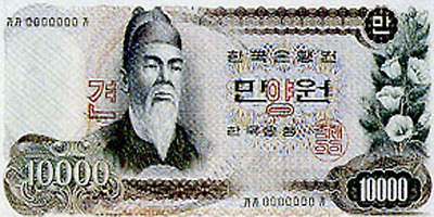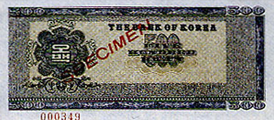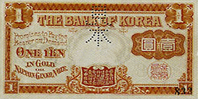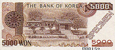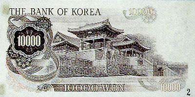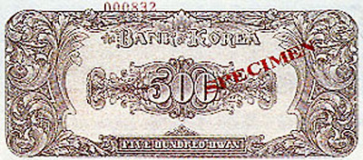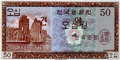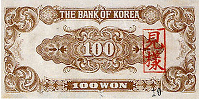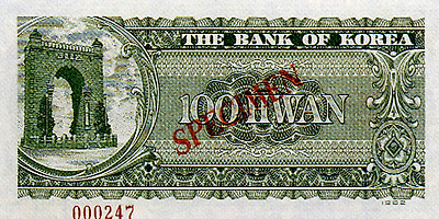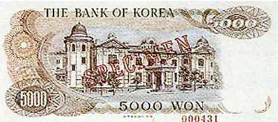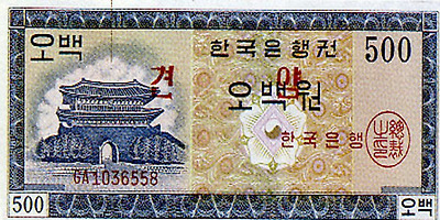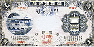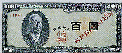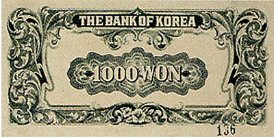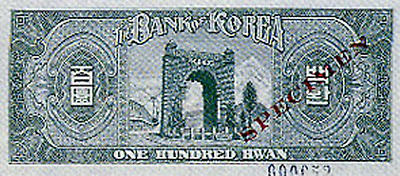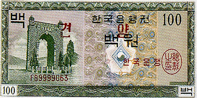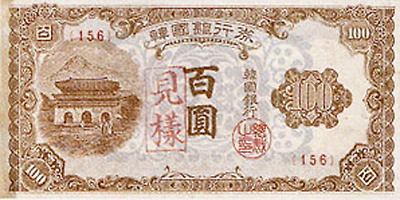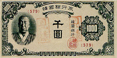 6.25전쟁당시 1950년 6월 설립된 한국은행에 의해 천원권과 백원권 지폐가 발행된다. 이 지폐에는 이승만 전대통령의 초상과 광화문이 도안으로 사용되었다.