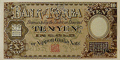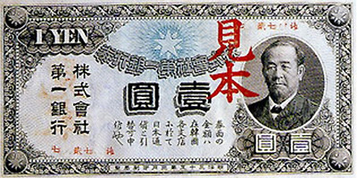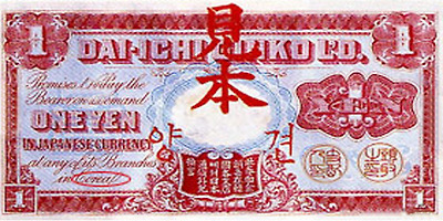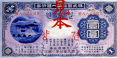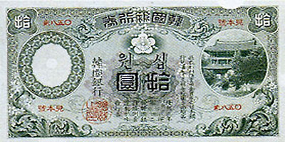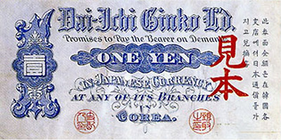 1902년 일본은 지폐유통을 병행 하여 조선을 식민지화하긴 수단으로 삼았다. 십원권 지폐에는 당시 제일 은행 총재였던 시부사와 에이찌의 초상이 도안으로 사용되었다.