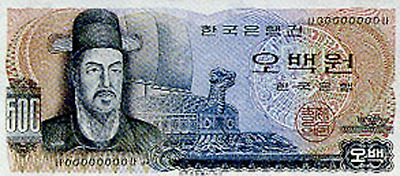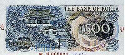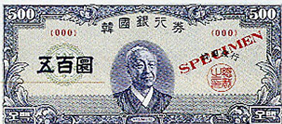 <초상을 우측으로 하여 도안한 1958년 발행된 오백환권(신) 지폐.>