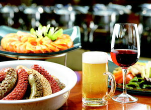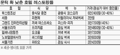 중소기업체 대표 김 모씨는 지난주 말 서울 웨스틴조선호텔 중식당 `홍연`에서 대학동창 12명과 점심 식사를 했다. 광둥식 해산물볶음 등 총 10가지 세트메뉴 가격은 6만2400원. 통상 이 식당의 10가지 세트메뉴 가격이 8만~9만원 선인 것을 감안하면 30~40% 정도 저렴한 가격대다. 특히 김씨가 조선호텔 멤버십 회원이라 2명 무료 제공 혜택을 받은 후 1인당 가격은 5만1600원으로 낮아졌다. 불황에 장사 없다고 고급 서비스의 대명사로 꼽히는 호텔 식당가가 요즘 문턱을 크게 낮추고 손님 맞기에 나섰다. 웬만한 식당보다 저렴한 1인분에 2만원짜리 식사도 등장했다. 더 이상 호텔 식사가 일부 부유층의 전유물이 아닌 셈이다. 서울프라자호텔 유럽식 레스토랑 `프라자펍`에서는 3만4800원짜리 점심 뷔페를 내놨다. 통상적으로 호텔 뷔페 식사 가격이 5만원 선임을 감안하면 30~40% 저렴한 수준이다. 밀레니엄 힐튼 호텔 오크룸에서는 최근 `카베리 와인 뷔페`를 선보이고 있다. 3만7200원에 칠레산 `홀리오 부숑`, 호주산 `야카 릿지`를 비롯한 와인을 야채 샐러드, 푸딩, 소시지, 쇠고기 립아이 스테이크, 멕시코식 미트 로프, 양다리 구이 등 뷔페 메뉴와 함께 무제한으로 즐길 수 있다.