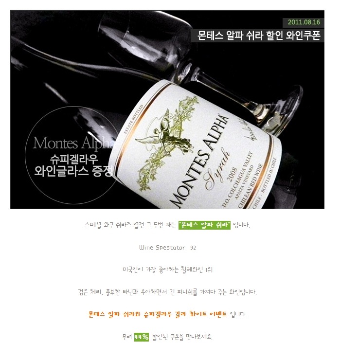 [[쿠폰]][와인쿠폰] 몬테스 알파 쉬라 44% 할인! 작성자olivia|작성시간11.08.23|조회수58 목록 댓글 0 글자크기 작게가 글자크기 크게가 www.winecoupon.co.kr 다음검색 현재 게시글 추가 기능 열기 북마크 공유하기 신고 센터로 신고 댓글 댓글 0 댓글쓰기 답글쓰기 댓글 리스트
