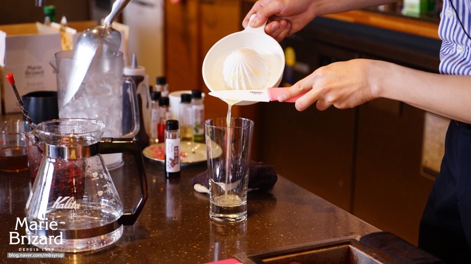 레몬 1/2조각을 스퀴즈를 이용해서 즙을 내주세요.