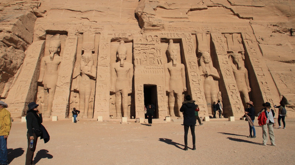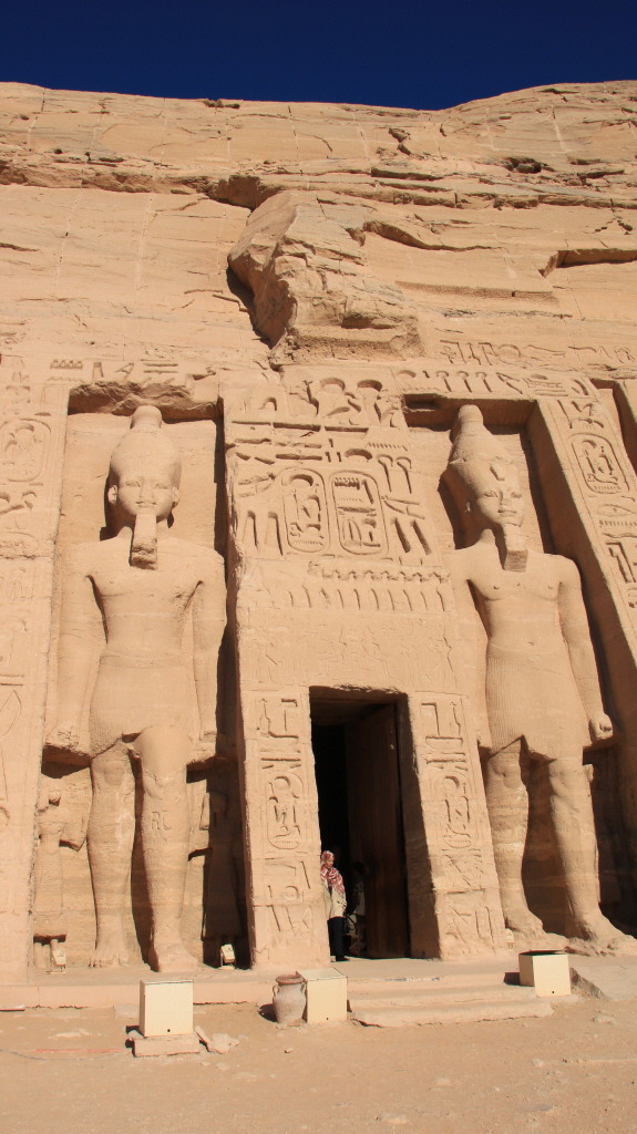 호루스 신과 하토르 신의 작은 입상들이 줄지어 선 입구에 있는 20m에 이르는 4명의 좌상은 모두 람세스 2세의 동일인물로 각각 상, 하 이집트를 의미하는 의상이 조각되어 있다.